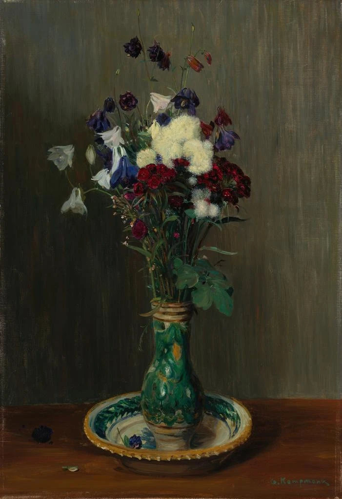 Art print | Ancolies and carnations in a green vase - Gustav Kampmann