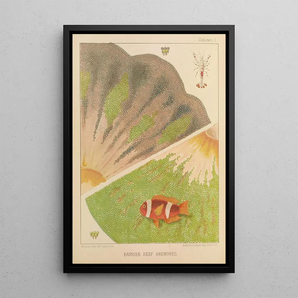 In this art print of Anemones of the Coral Reef II, William Saville-Kent immerses us in a vibrant and colorful underwater world. The vivid hues of the anemones, ranging from pink to purple, contrast with the shades of blue of the water, creating a dynamic and captivating composition. The artist's technique, which combines realism and impressionist touches, allows you to feel the bustling life within this marine ecosystem. This artwork evokes the fragile beauty of the seabed and reminds us of the importance of their preservation.