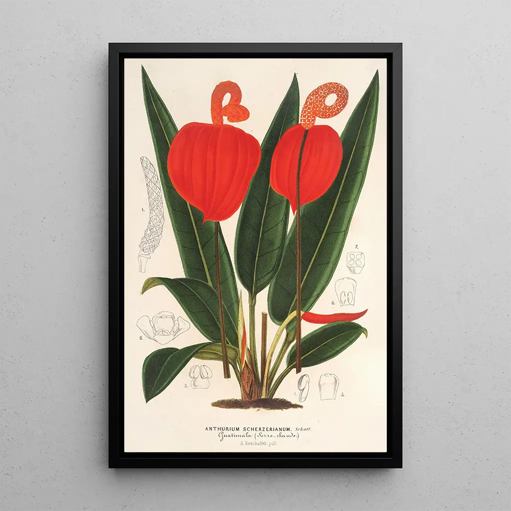 Anthurium Scherzerianum: a burst of tropical colors The Anthurium Scherzerianum, with its heart-shaped flowers and vibrant hues, is a true masterpiece of nature. Its bright red bracts contrast with the deep green of its leaves, creating a captivating visual composition. This plant, native to the tropical forests of Central America, evokes a warm and welcoming atmosphere. Every detail of this flower, from its smooth texture to its unique shape, invites wonder and appreciation for the biodiversity that surrounds us. Charles Antoine Lemaire: the art of botany in the 19th century Charles Antoine Lemaire, a French botanist and horticulturist, was a key figure in the discovery and classification of exotic plants, notably species of anthuriums. His expertise and passion for plants led to the publication of several influential works, which helped to better understand and appreciate the richness of tropical flora. Lemaire also contributed to the creation of botanical gardens, fostering the exchange of knowledge between botanists and plant enthusiasts. His legacy endures through generations, inspiring those who marvel at the beauty of flowers. A decorative acquisition with multiple advantages The art print of the Anthurium Scherzerianum is an ideal decorative choice to enhance any space, whether a living room, an office, or a bedroom. Its vivid color and distinctive shape add a touch of dynamism and joy to your interior. The quality of the reproduction ensures fidelity to the details of the original, allowing you to enjoy the beauty of this plant without the constraints of its maintenance. With its aesthetic appeal, this print will appeal to decoration and botany enthusiasts, bringing a note of freshness and vitality to your environment.