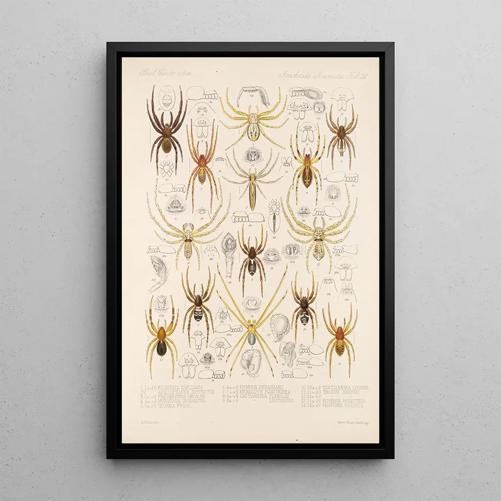 Arachnida Araneidea Pl 32 : a woven world of mysteries The art print "Arachnida Araneidea Pl 32" by Frederick DuCane Godman immerses us in a fascinating universe, where the delicacy of spiders is brought to light. The meticulous details of each creature, rendered with soft and natural colors, create an atmosphere that is both intriguing and soothing. The watercolor technique, combined with precise strokes, captures the very essence of these arachnids, revealing their elegant shapes and unique textures. This art print invites attentive contemplation, where each element seems to tell a story — that of the often little-known beauty of the spider world. Frederick DuCane Godman: a pioneer of naturalist illustration Frederick DuCane Godman, active in the 19th century, is recognized for his major role in naturalist illustration. Influenced by the scientific discoveries of his time, he skillfully combined art and science, providing accurate representations of fauna and flora. His work, particularly in the field of arachnids, contributed to a better understanding of these often feared species. Godman collaborated with many scientists, and his works have become references in biological studies. His legacy endures, demonstrating the importance of art in popularizing scientific knowledge. A decorative acquisition with multiple assets The art print "Arachnida Araneidea Pl 32" is a decorative piece that will enhance any space, whether a living room, office, or bedroom. Its print quality and color fidelity make it an ideal choice for those who appreciate naturalist art. The aesthetic appeal of this canvas lies in its ability to evoke curiosity and spark conversation. By integrating this piece into your decor, you bring a touch of elegance and sophistication, while celebrating the beauty of the natural world.