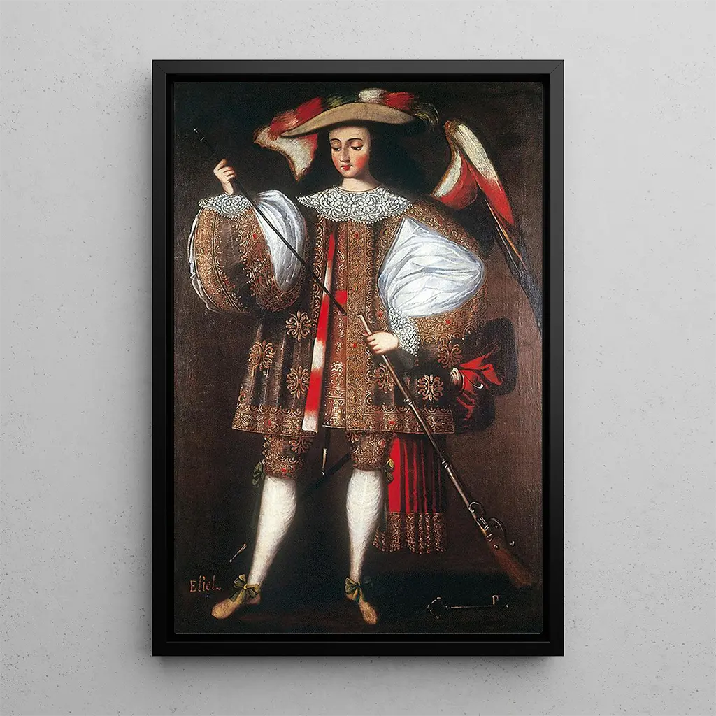 The School of Cusco, which flourished in the 17th century, is a symbol of the fusion between Andean traditions and European influences. Artists of this period, often of indigenous origin, skillfully integrated elements of local culture into religious themes imported by colonizers. The art print of Archangel Eliel, as an emblematic work, perfectly illustrates this artistic hybridization. Cusco artists, such as those who contributed to this representation, were influenced by Spanish Baroque while preserving their cultural identity, thus creating a unique and recognizable style.