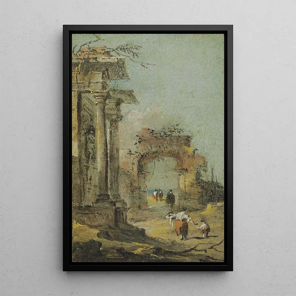 In this captivating art print, Francesco Guardi transports us to the heart of a landscape imbued with melancholy and beauty. The architectural ruins, delicately rendered, blend with human figures that seem to wander through this timeless setting. The soft colors and play of light create a poetic atmosphere, where every detail invites contemplation. Guardi's technique, combining oil and light brushwork, brings this scene to life, evoking both the grandeur of a bygone era and the fragility of memories. This painting, a true ode to architecture, encourages reflection on the passage of time and the ephemeral nature of beauty.