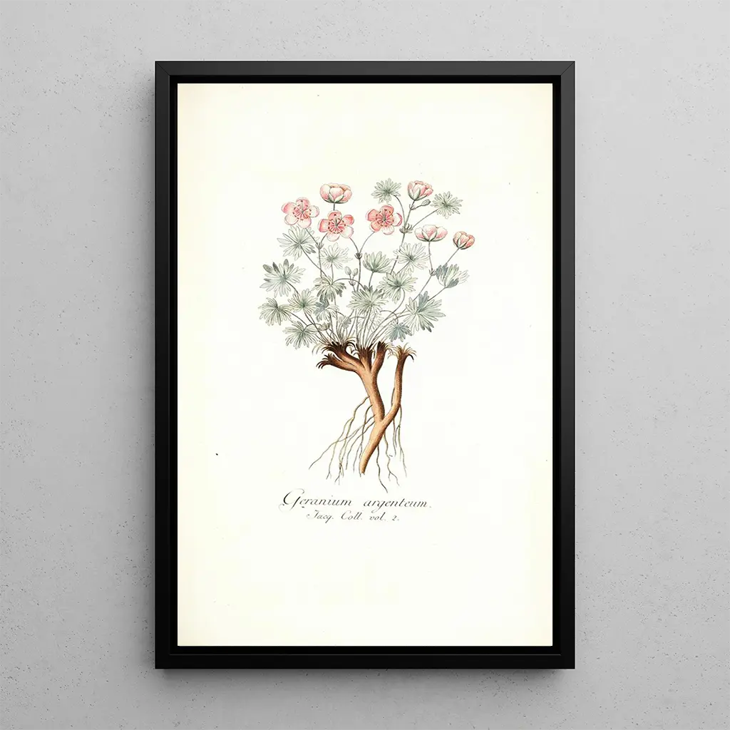 The art print Geranium argenteum, by Nikolaus Joseph Freiherr von Jacquin, transports us into a botanical universe where the finesse of details blends with a palette of soft and soothing colors. The composition highlights the beauty of silvery leaves and delicate flowers, creating a serene and contemplative atmosphere. The painting technique, combining precision and lightness, allows us to almost feel the texture of the petals and the freshness of the plant. Each brushstroke seems to capture the light, making the silvery and green nuances shine, and inviting the viewer to a careful exploration of nature.