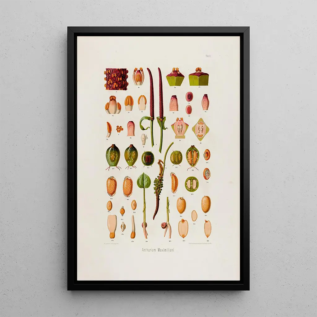 Aroideae Maximilianae Pl05: an exploration of botanical wonders The artwork "Aroideae Maximilianae Pl05" by Heinrich Wilhelm Schott is a captivating representation of the diversity of aroid plants. This art print showcases exquisite details of the leaves and flowers, with vibrant colors that capture the essence of tropical flora. The rich shades of green, cream, and violet combine to create a harmonious and lively composition. The engraving technique used by Schott highlights the texture and shape of the plants, offering an immersive visual experience that transports the viewer to a lush garden. Heinrich Wilhelm Schott: a master of botanical illustration Heinrich Wilhelm Schott, active in the 19th century, is recognized as one of the pioneers of botanical illustration. His works, including "Aroideae Maximilianae Pl05," are the result of his explorations and his passion for botany. Influenced by the discoveries of his time, he skillfully blended art and science, creating illustrations that are both aesthetic and informative. Schott contributed to the understanding of tropical plants, making his works valuable for botanists and art enthusiasts alike. His legacy endures through his illustrations, which continue to inspire and amaze. A decorative acquisition with multiple benefits The art print "Aroideae Maximilianae Pl05" is an ideal decorative choice to enhance your living space. Whether in a living room, office, or bedroom, this piece adds a touch of nature and elegance. Its print quality and fidelity to detail make it a captivating art piece that draws the eye and garners admiration. With its captivating aesthetic, this canvas is not only a decorative element but also a source of inspiration and serenity, transforming your interior into a haven of peace.
