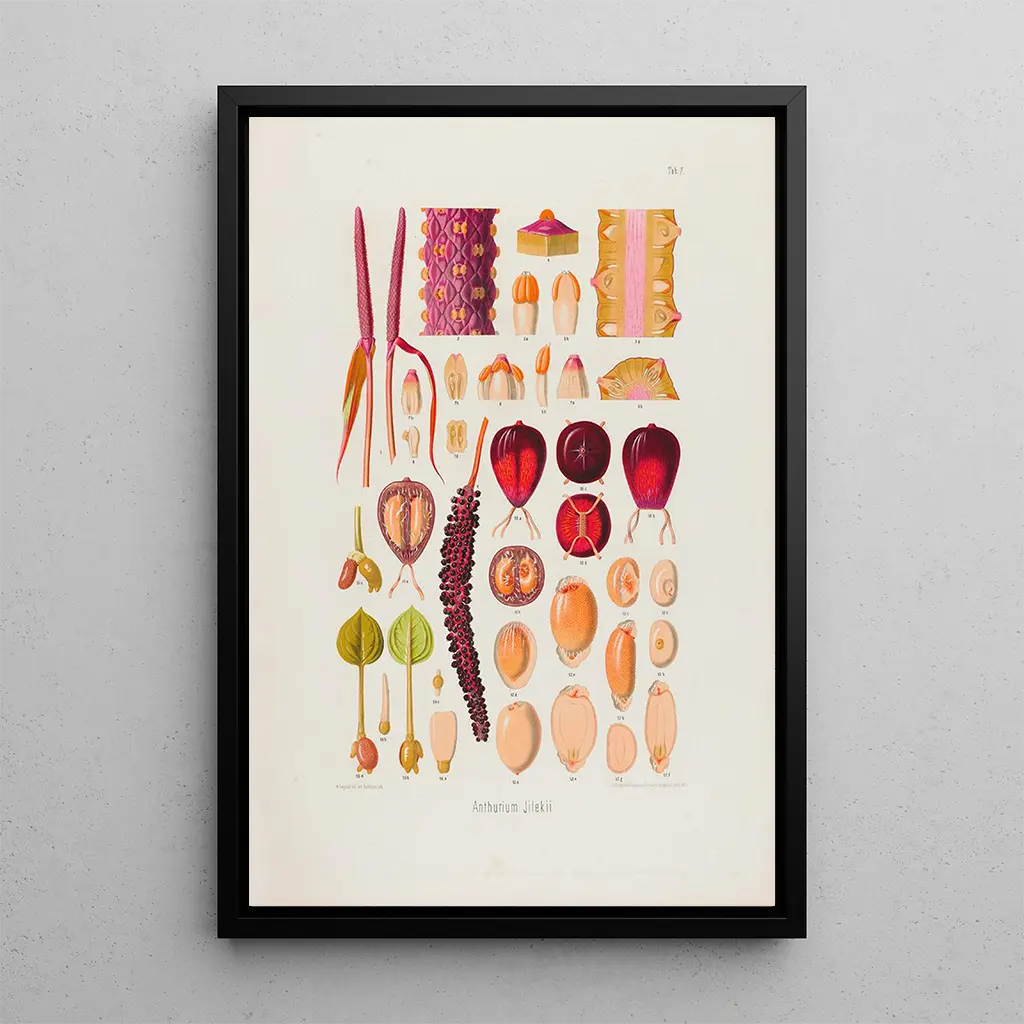 The art print Aroideae Maximilianae Pl07 is a true invitation to discover the complexity of plant shapes. With its sinuous lines and vibrant hues, this piece captures the very essence of nature. The meticulous details of the leaves and flowers are highlighted by a subtle play of light, creating an almost magical atmosphere. Each element of this canvas seems to tell a story, that of a rich and dynamic ecosystem. The artist manages to convey a sense of movement and life, making this work a true masterpiece of botanical illustration.