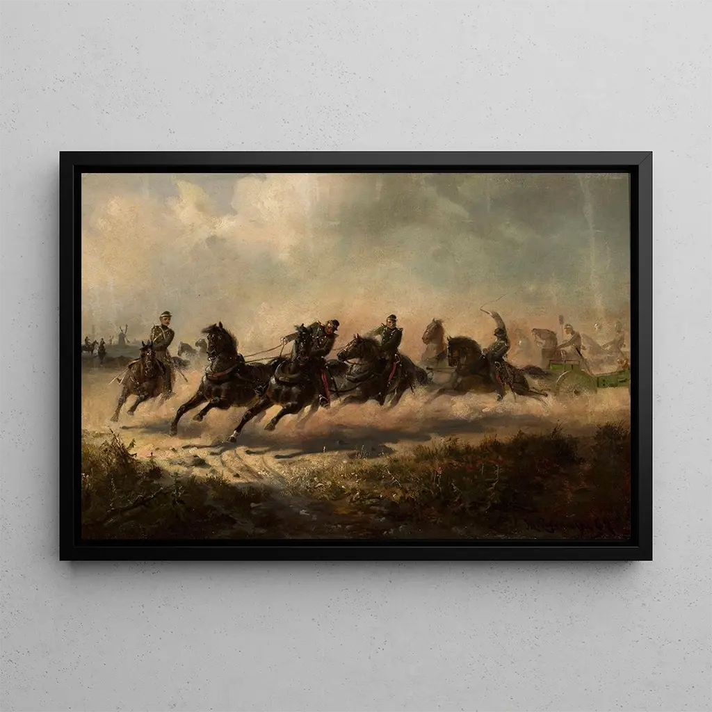 The canvas "Charge d'Artillerie" by Maksymilian Gierymski depicts a dynamic and striking scene of war, where the power and determination of soldiers are highlighted. The dark colors and strong contrasts create an atmosphere of tension and urgency, while the horses and cannons seem to come to life under the artist's brush. Gierymski succeeds in capturing the movement and energy of this charge, inviting the viewer to feel the intensity of the action. This art print is more than a simple military representation; it evokes the bravery and sacrifice of men in times of conflict.