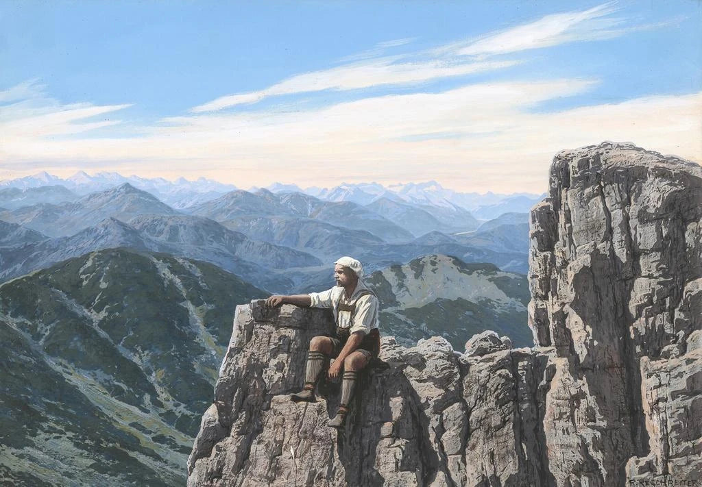 The work "The artist on the Plankenstein" by Rudolf Reschreiter immerses us in a universe where nature and art meet with poignant intensity. The composition features a contemplative artist, lost in thought, while the mountain landscape, bathed in shades of emerald green and azure blue, evokes an almost mystical serenity. The brushstrokes, both delicate and bold, create a vibrant atmosphere, where each element seems to tell a story. Light plays a crucial role, subtly illuminating the details of the painting and enhancing the emotion it conveys. This piece invites deep reflection on the relationship between the artist and their environment.