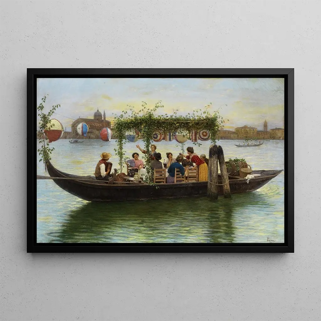The artwork "At the Redemptor Festival" by Luigi Pastega immerses us in a festive and colorful atmosphere, where the characters seem to dance to the rhythm of collective joy. The vivid colors, ranging from deep reds to bright yellows, create a striking contrast that immediately draws the eye. The artist's technique, blending realism with impressionist touches, brings every detail to life, from smiling faces to the draped clothing. This canvas evokes a scene of conviviality, where one can almost hear the sounds of laughter and singing, inviting the viewer to share this moment of happiness.