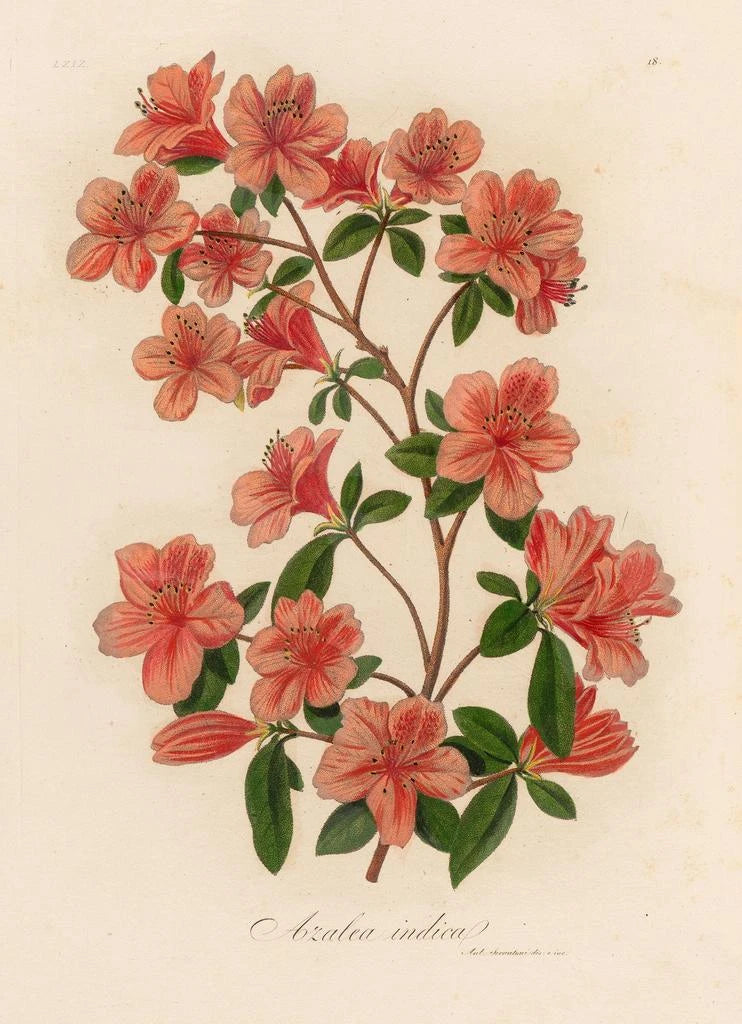 The Azalea indica, with its vibrant petals and lush bloom, evokes a garden in full effervescence. This art print, capturing the ephemeral beauty of nature, stands out with its dazzling shades of pink, red, and white. The artist's technique, blending watercolor and drawing, creates a delicate and poetic atmosphere, inviting the viewer to immerse themselves in an enchanting floral world. Every detail, from the leaves to the flowers, is rendered with precision that reflects meticulous observation and a passion for the subject.