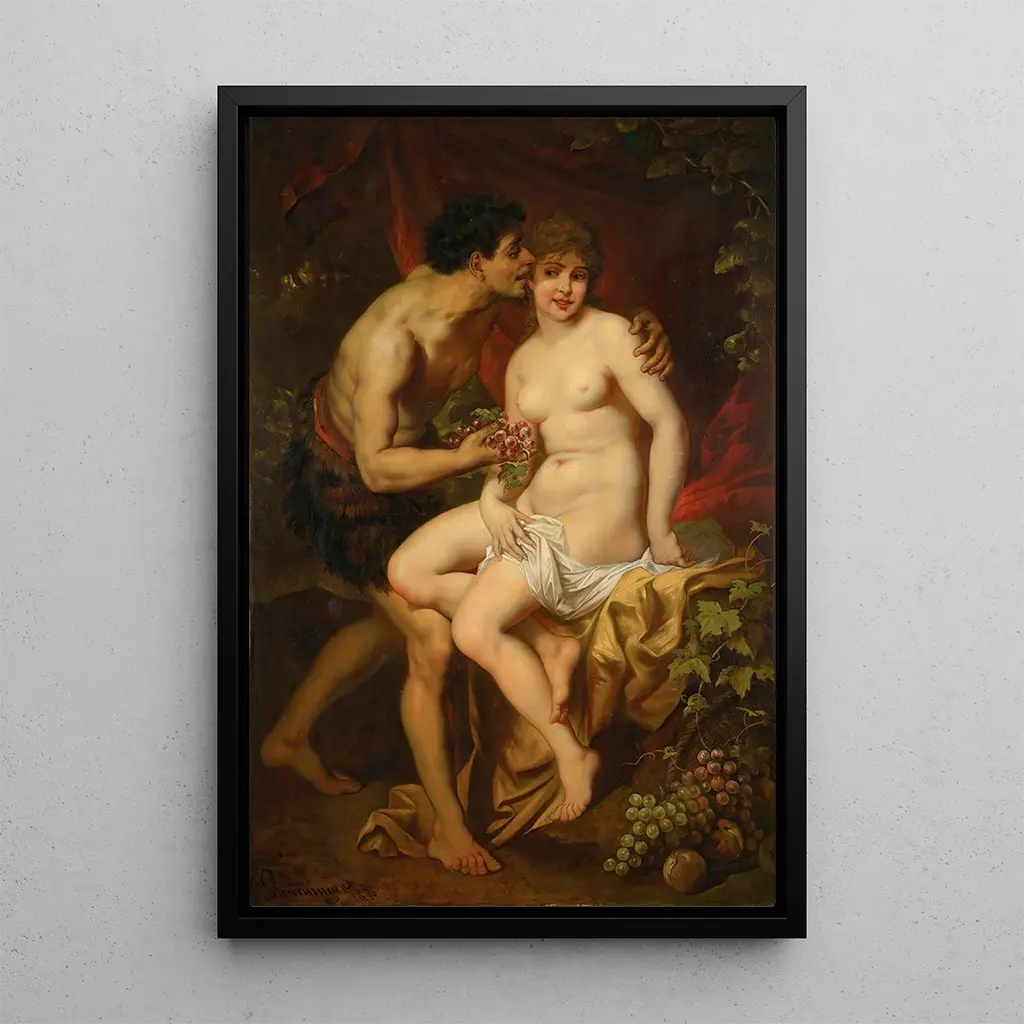 The art print of Bacchus, an iconic work by Carl Schweninger, evokes a festive and joyful atmosphere. The vibrant colors, ranging from lush greens to shimmering golds, create a striking contrast that immediately captures the eye. The artist's technique, blending realism and impressionist touches, brings this mythological scene to life where Bacchus, the god of wine, is surrounded by nymphs and fruits. The overall impression conveys a sense of movement and lightness, as if one could almost hear the laughter and songs of the guests. This canvas invites contemplation and escapism, transporting the viewer to a world of delights.