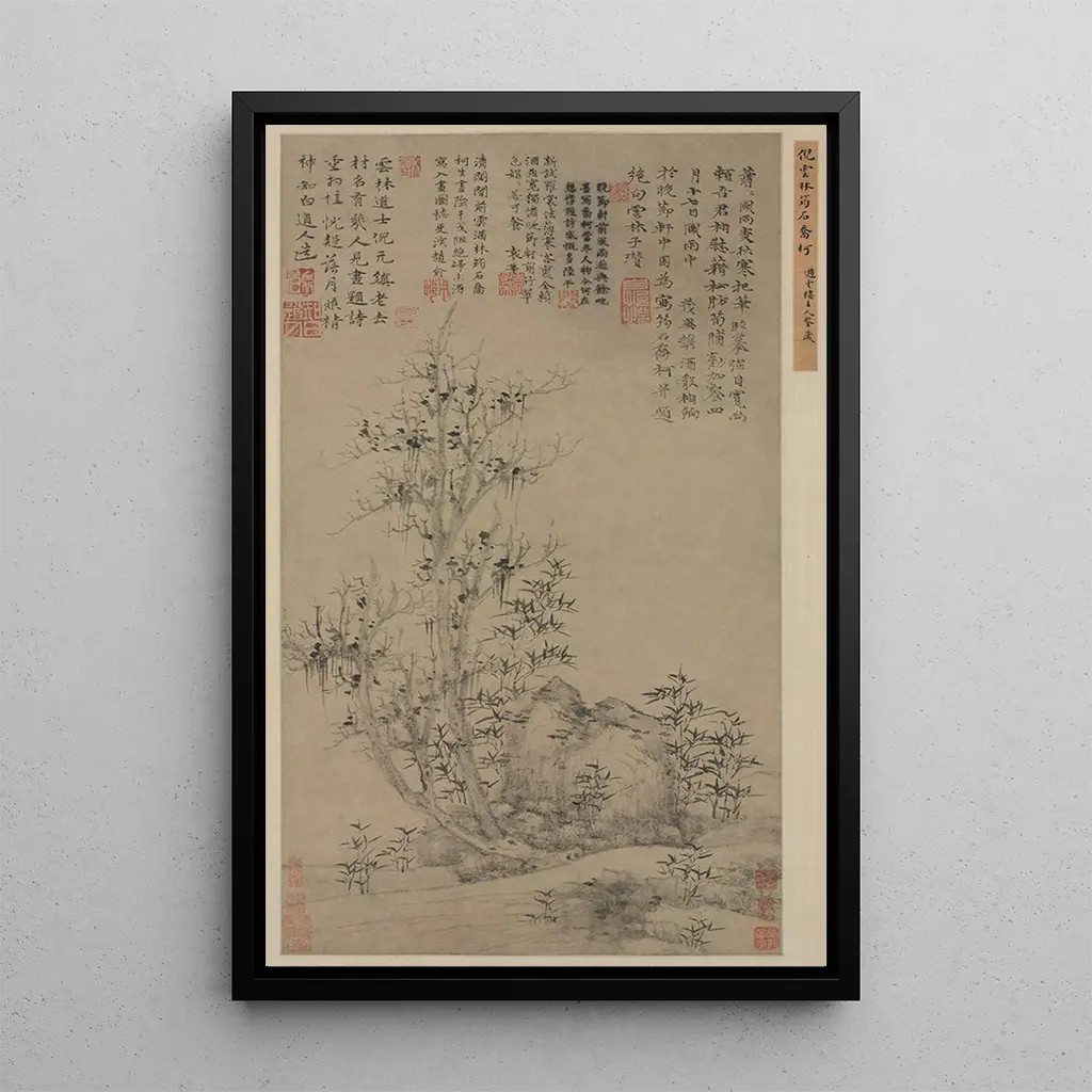 In this captivating art print, Ni Zan transports us to a landscape imbued with tranquility. The bamboo rock, majestically painted, stands gracefully, while the large tree, with its extended branches, seems to whisper ancient secrets. The soft colors and delicate shades create a soothing atmosphere, inviting the viewer to silent contemplation. The ink and water technique, typical of Chinese painting, gives this art print a lightness and fluidity that evoke the breath of wind through the leaves. Every detail, carefully crafted, immerses us in a universe where nature reigns supreme.