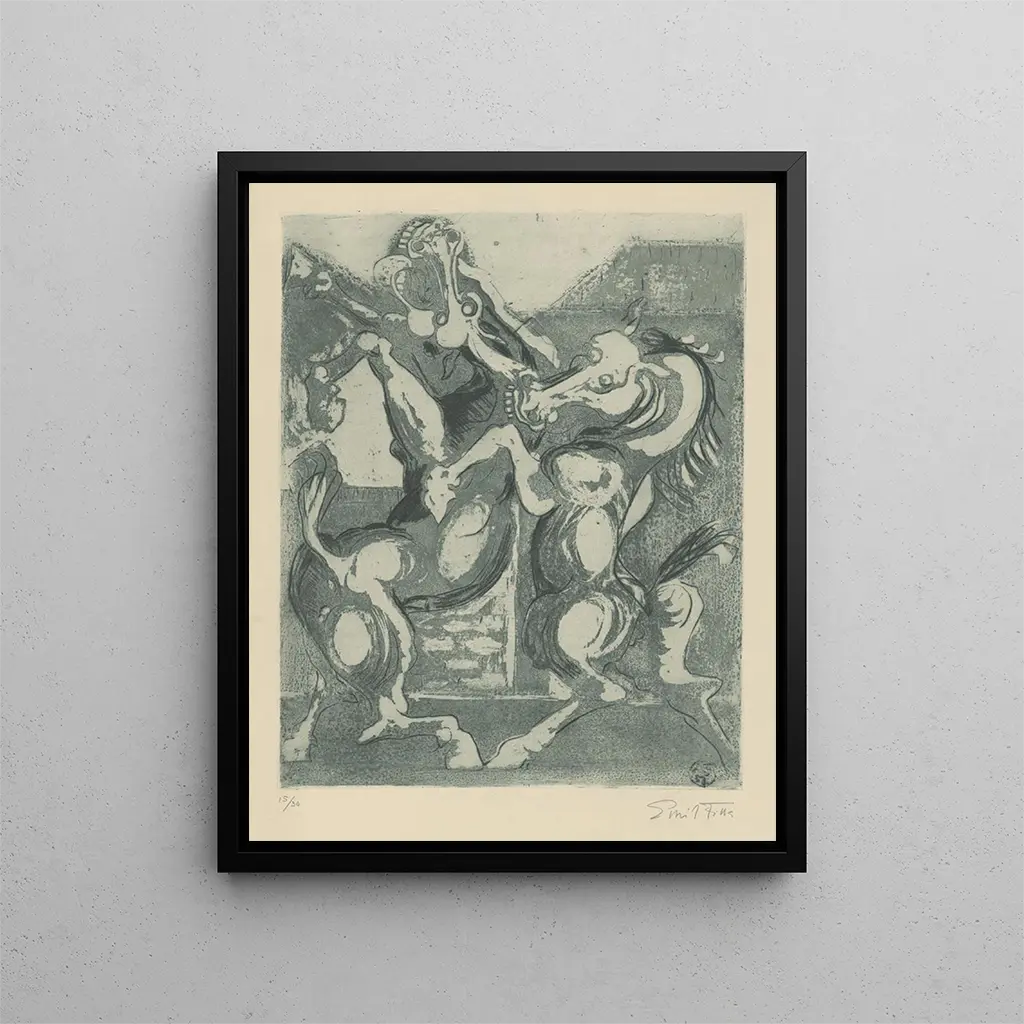 Reproduction Bataille - Emil Filla – Introduction captivante Dans l'univers riche et complexe de l'art moderne, l'œuvre "Bataille" d'Emil Filla se dresse comme un témoignage vibrant de la lutte intérieure et des tensions psychologiques qui habitent l'humanité. Cette pièce, à la fois puissante et évocatrice, invite le spectateur à plonger dans un monde de contrastes, où la violence et la beauté se rencontrent. La reproduction Bataille - Emil Filla permet de découvrir cette œuvre emblématique sous un nouveau jour, offrant une immersion dans l'esprit tourmenté de l'artiste et dans les tumultes de son époque. À travers cette œuvre, Filla nous confronte à des émotions brutes et profondes, nous incitant à réfléchir sur la nature même de l'existence. Style et singularité de l’œuvre Le style d'Emil Filla est marqué par une approche audacieuse et expressive, caractérisée par des formes angulaires et des couleurs saisissantes. Dans "Bataille", l'artiste déploie une palette de teintes sombres, accentuant le drame de la scène qu'il représente. Les figures semblent se débattre dans une lutte acharnée, leurs corps contorsionnés évoquant à la fois la souffrance et la résilience. Cette œuvre se distingue par son dynamisme, où chaque coup de pinceau semble chargé d'énergie et de tension. Filla joue habilement avec la lumière et l'ombre, créant des contrastes saisissants qui renforcent l'intensité émotionnelle de la composition. L'œuvre ne se contente pas de représenter une bataille physique ; elle illustre également un combat psychologique, une lutte entre les forces opposées qui habitent l'âme humaine. L’artiste et son influence Emil Filla, figure emblématique du cubisme tchèque, a su s'imposer comme un pionnier de la modernité artistique au début du XXe siècle. Son parcours est marqué par une quête incessante de nouvelles formes d'expression, influencées par les grands maîtres de son temps, tout en restant profondément ancrées dans son identité culturelle. Filla a navigué entre différentes écoles artistiques, intégrant des éléments du surréalisme et de l'expressionnisme dans son œuvre. Il a également été un fervent défenseur de l'art engagé, utilisant son talent pour commenter les tragédies de son époque, notamment les conflits mondiaux