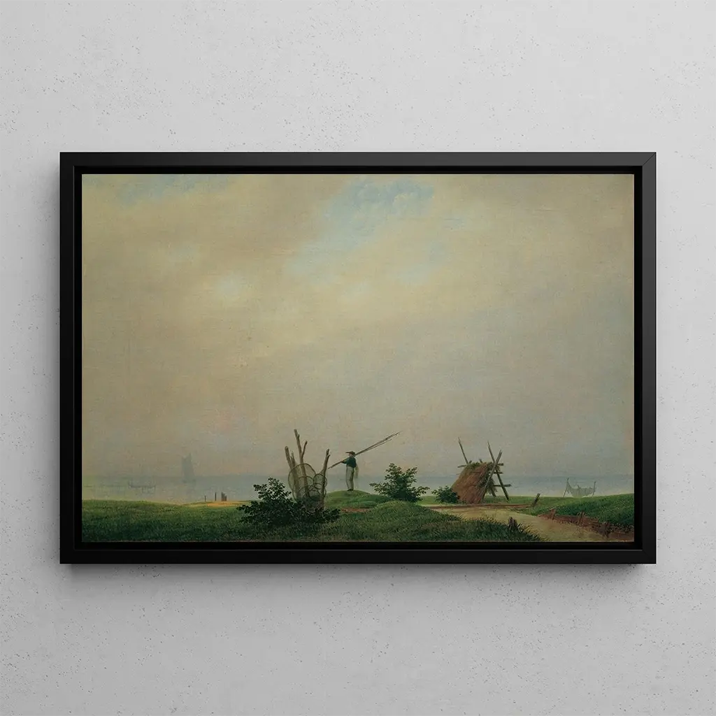 The art print "Beach with Fisherman" by Caspar David Friedrich evokes a peaceful scene where man and nature coexist in perfect harmony. The soft colors of the sky blend with the warm hues of the sand, creating a serene and contemplative atmosphere. The fisherman, a discreet silhouette, appears absorbed in his activity, while the waves gently lap the shore. Friedrich's technique, characterized by a subtle play of light and shadow, invites the viewer to immerse themselves in this moment of tranquility, where time seems suspended. This work, a true ode to nature, reminds us of the importance of simplicity and the beauty of everyday life.