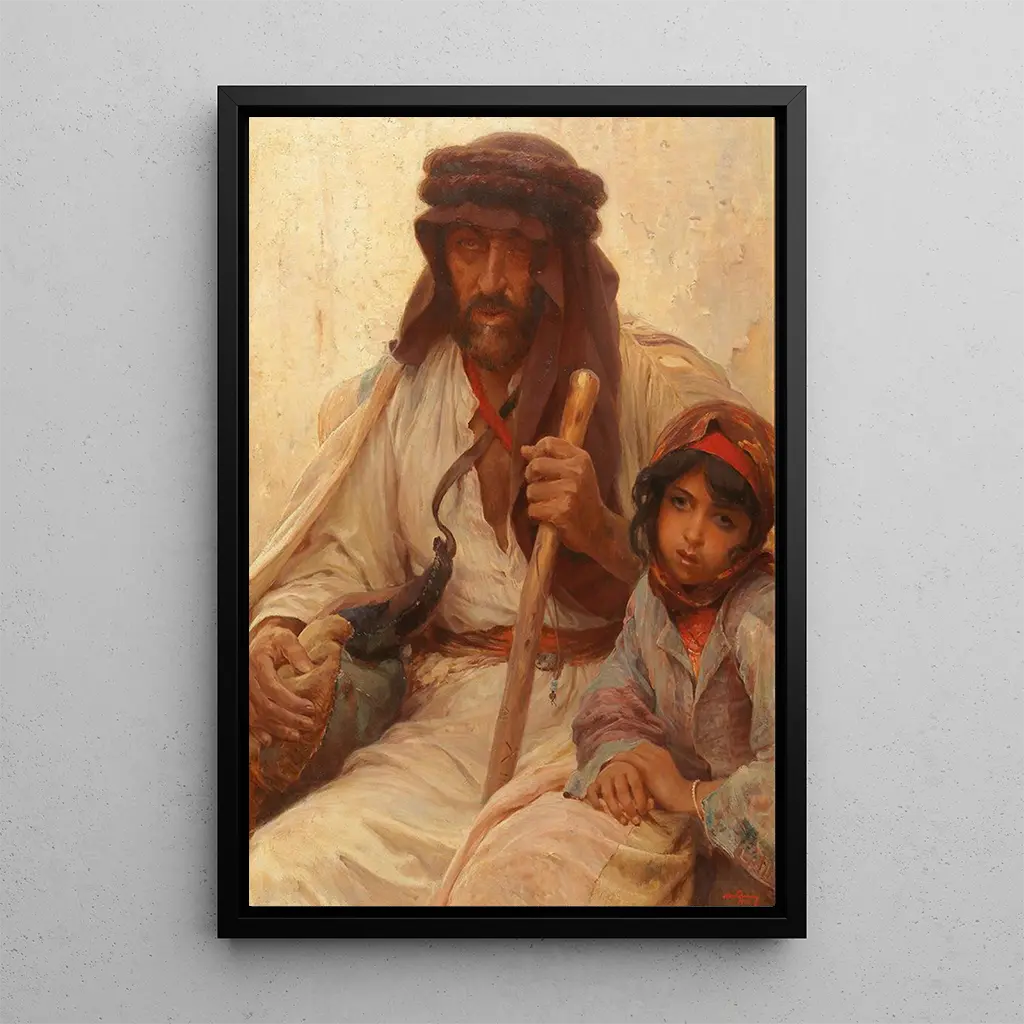 Bedouin and Young Girl: A Meeting of Cultures In "Bedouin and Young Girl," Alois Hans Schram immerses us in a scene rich in emotion and color. The painting highlights a fascinating interaction between a young Bedouin and a girl, symbolizing harmony between different cultures. The warm hues of the desert contrast with traditional clothing, creating a vibrant and lively atmosphere. Schram's technique, blending realism with impressionist touches, brings this encounter to life, capturing the essence of a shared moment filled with curiosity and mutual respect. Alois Hans Schram: an artist at the crossroads of influences Alois Hans Schram, a 19th-century painter, is often recognized for his ability to fuse elements of different cultures in his works. Influenced by Romanticism and travel, he skillfully integrated oriental themes into his art, reflecting the cultural exchanges of his time. His work demonstrates a particular sensitivity to the subjects he depicts, whether portraits or scenes of everyday life. Schram left his mark with his unique vision, and his art continues to inspire through its depth and humanity. A decorative art print with multiple assets The art print of "Bedouin and Young Girl" is a valuable addition to your interior decoration. This painting, with its warm atmosphere and message of openness, fits perfectly in a living room, office, or bedroom. The quality of the reproduction ensures remarkable fidelity to the details and colors of the original artwork, allowing you to fully appreciate its beauty. By choosing this art print, you give your space a touch of exoticism and culture, while creating a welcoming and inspiring atmosphere.