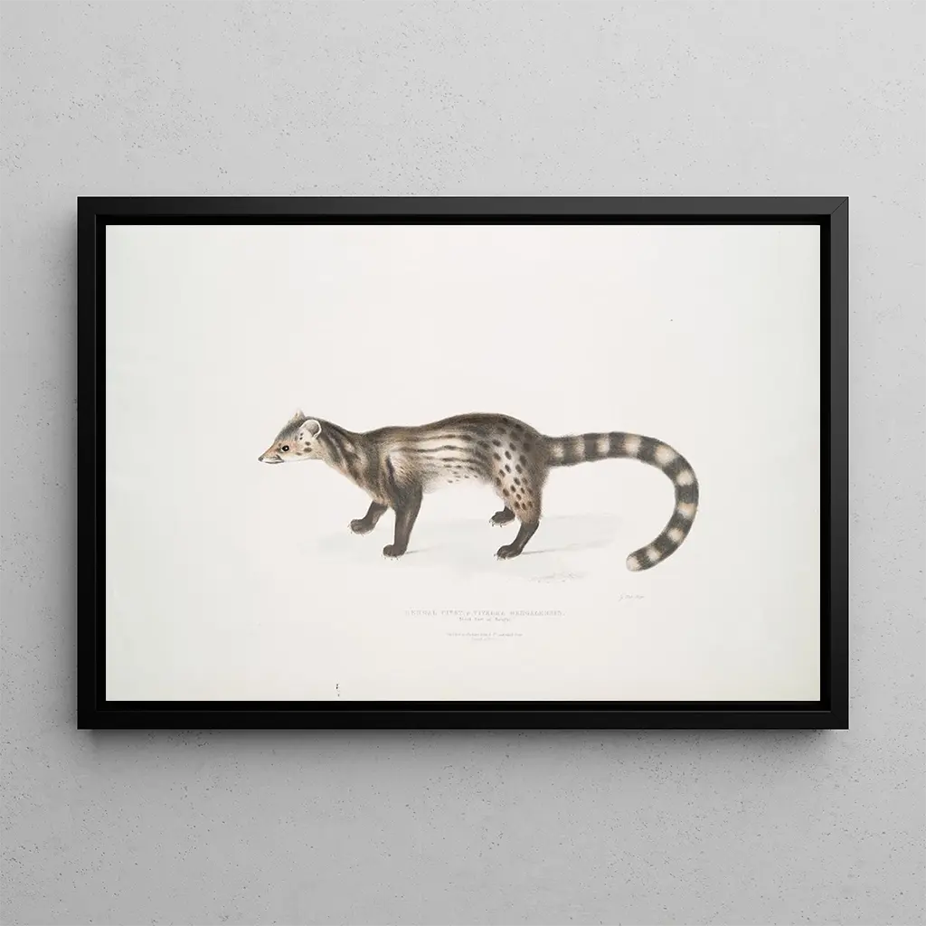 John Edward Gray, 19th-century British naturalist and zoologist, played a crucial role in documenting wildlife. His works, often created for scientific publications, reflect an era when exploration and species classification were at their peak. Influenced by the discoveries of his contemporaries, Gray managed to combine scientific rigor with artistic sensibility. His work on the Bengal civette is part of a tradition of illustration aimed at educating the public while celebrating the beauty of nature. His contribution to zoology and art remains significant, marking a time when art and science converged.