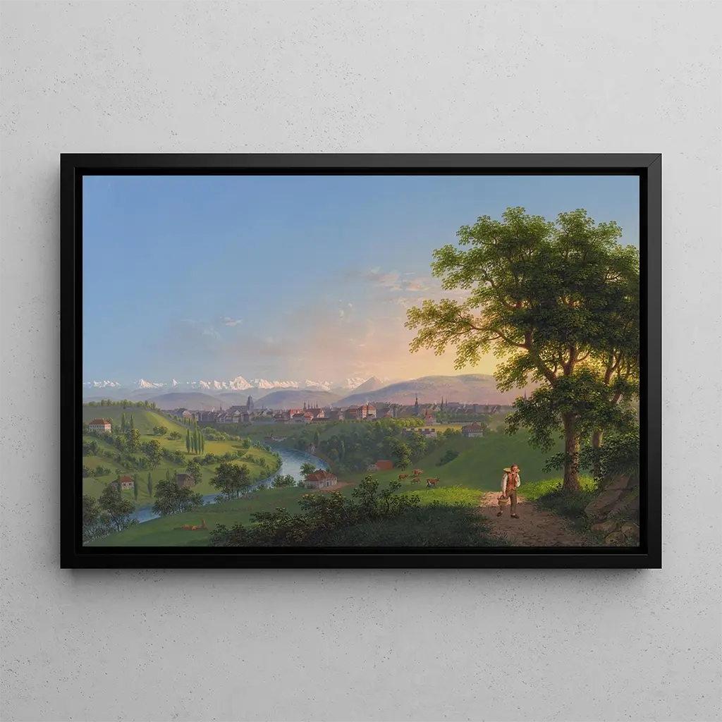 The art print of Bern, a work by Johann Heinrich Bleuler the Younger, transports us to the heart of an idyllic landscape. With its soft hues and shades of green, the artist manages to capture the serenity of the banks of the Aare River. The meticulous details of the historic buildings, combined with the majesty of the mountains in the background, create a calming and contemplative atmosphere. The oil painting technique allows Bleuler to play with light, emphasizing reflections on the water and bringing this bucolic scene to life. Every brushstroke seems to tell a story, inviting the viewer to immerse themselves in this painting.