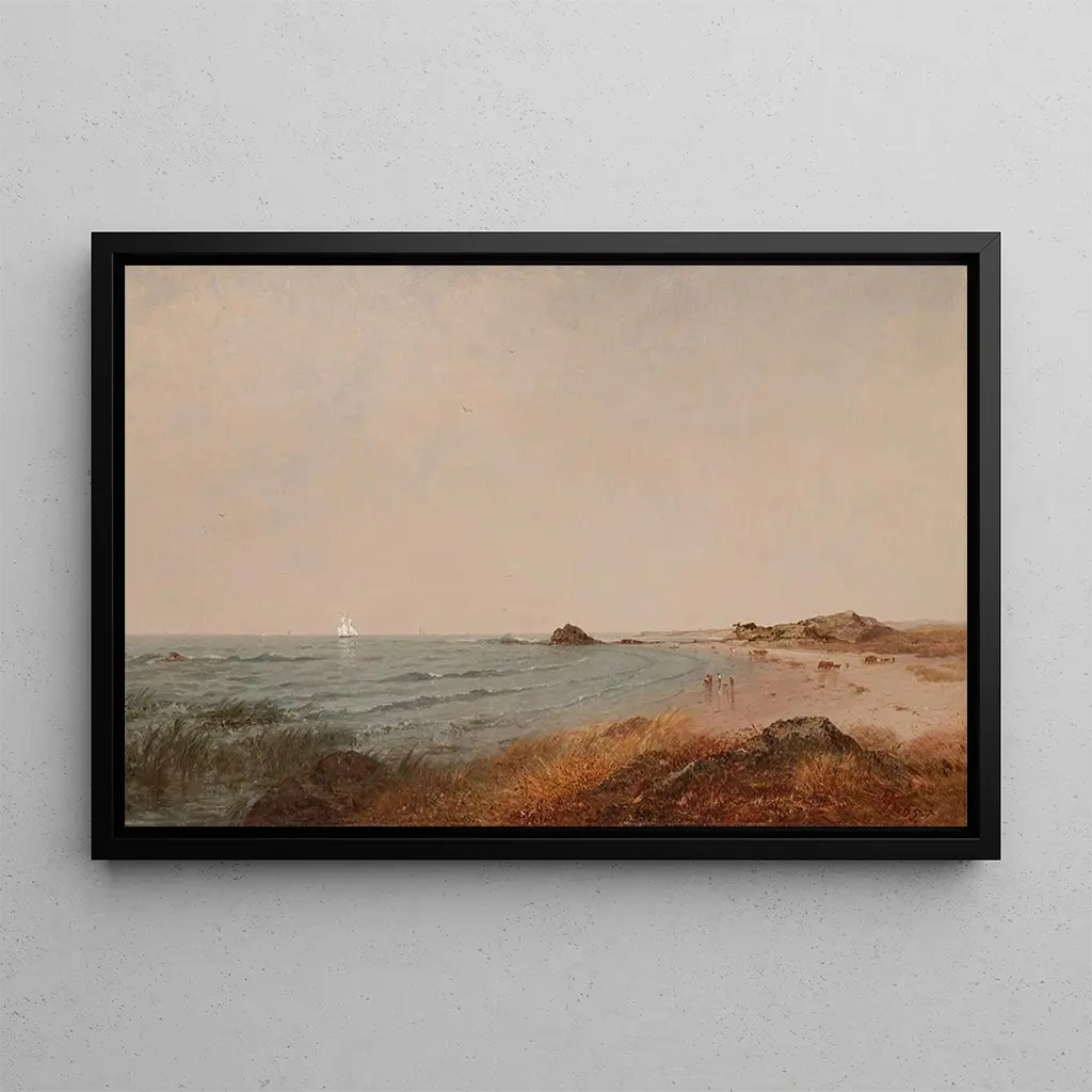 "Beverly Beach, Massachusetts" is an artwork that captures the very essence of a sunny day by the water. John Frederick Kensett, with his mastery of colors and light, offers us a vibrant scene where the waves gently caress the shoreline. The shades of blue and sand intertwine, creating a striking contrast that evokes summer warmth. Kensett's technique, characterized by delicate brushstrokes, brings this lively beach scene to life, where bathers and sailboats add a dynamic dimension to the overall composition.