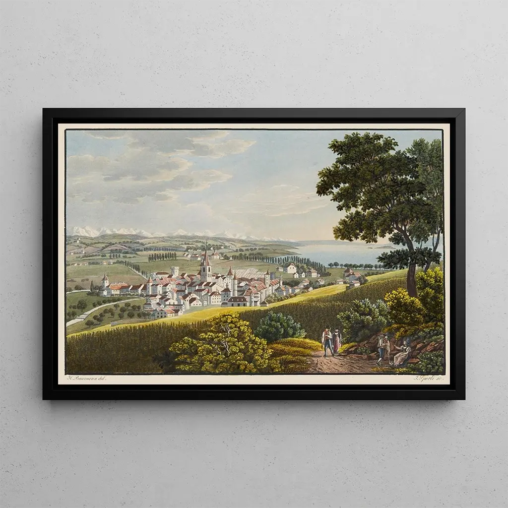 The Jean Henri Baumann art print of Bienne depicts a serene landscape, where nature unfolds in all its splendor. The soft and soothing tones of this piece invite contemplation, while the light plays with the shapes, creating an almost dreamlike atmosphere. Baumann's technique, blending watercolor and oil, gives the work a lightness and fluidity that capture the very essence of tranquility. Every detail, from majestic trees to reflections in the water, contributes to a visual harmony that transports the viewer to a world of peace and beauty.