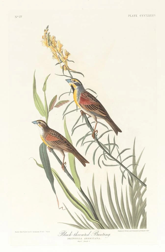 Le Bruant à gorge noire, capturé par John James Audubon, évoque une harmonie délicate entre la faune et la flore. Cette œuvre, réalisée avec une précision ornithologique remarquable, présente le volatile dans son habitat naturel, entouré d'une végétation luxuriante. Les couleurs vives et les détails minutieux des plumes créent une atmosphère vivante, presque palpable. Audubon, avec sa technique aquarellée, parvient à transmettre non seulement l'apparence de l'oiseau, mais aussi l'essence même de son environnement, invitant le spectateur à une contemplation silencieuse de la beauté sauvage.