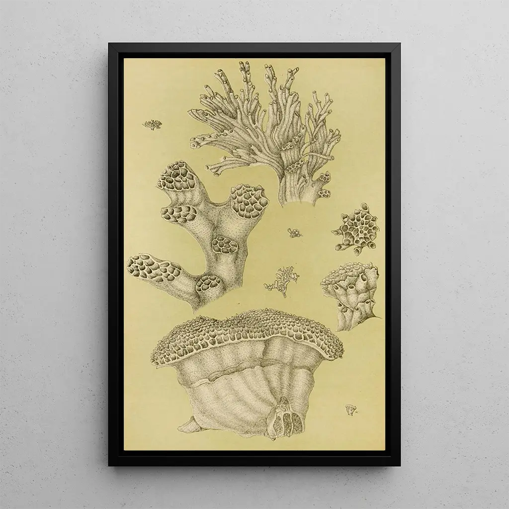 In "Bryozoaires II," Frederick McCoy immerses us in an underwater world where the delicacy of organic forms blends with a palette of soft, soothing colors. The intricate details of bryozoans, these often little-known aquatic creatures, are highlighted through a precise engraving technique that masterfully captures light and shadows. The atmosphere of the artwork evokes an almost hypnotic serenity, inviting viewers to contemplate the fragile beauty of nature. Each element seems to dance in the water, creating a harmonious composition that draws the eye and sparks the imagination. Frederick McCoy: a pioneer of natural history Frederick McCoy, a 19th-century naturalist and artist, played a vital role in documenting marine species. His work aligns with the scientific realism movement, where meticulous observation and faithful representation of organisms are paramount. Influenced by the discoveries of his era, McCoy skillfully combined art and science, making his works not only aesthetically pleasing but also educational. "Bryozoaires II" reflects his commitment to illustrating marine biodiversity, while also highlighting the growing importance of natural sciences during this period. A decorative art print with multiple virtues The reproduction of "Bryozoaires II" is a decorative piece that will enhance various spaces, whether a living room, office, or bedroom. Its print quality and fidelity to the original details make it an ideal choice for art and nature enthusiasts. By integrating this art print into your decor, you add a touch of elegance and curiosity, while also sparking conversations about the beauty of marine forms. This artwork, a true homage to the richness of aquatic life, is an aesthetic asset that will enrich your interior.