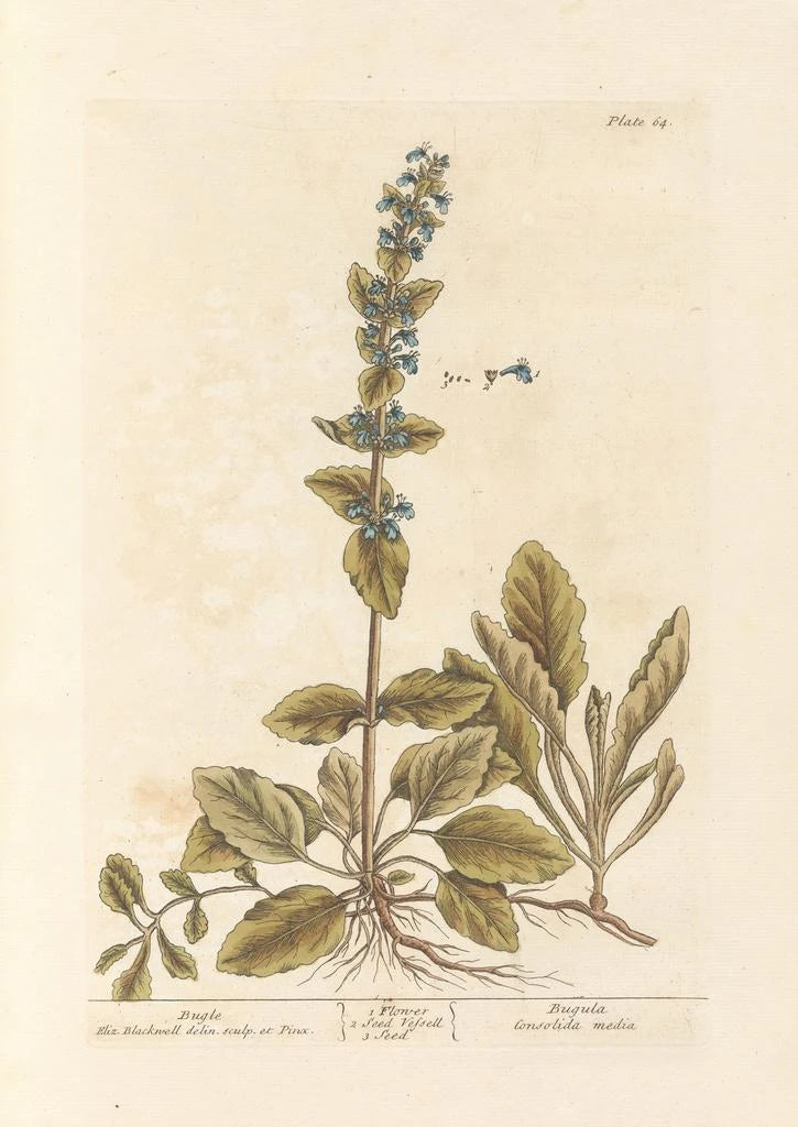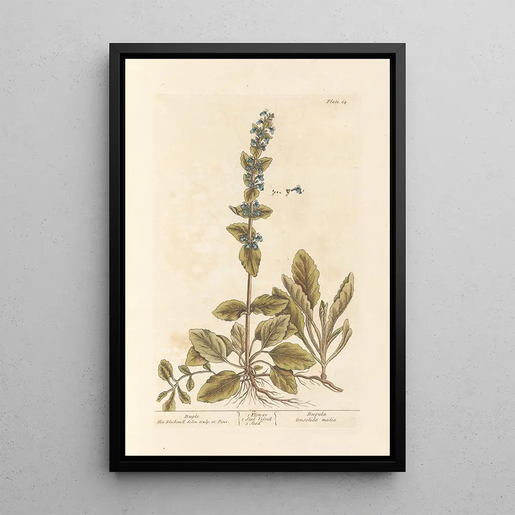The art print of Elizabeth Blackwell's "Bugle" immerses us in a world where every floral detail is highlighted with remarkable precision. The rich and varied hues of this canvas evoke the diversity of plants, while the carefully arranged composition draws the eye and invites exploration. The botanical illustration technique, characteristic of Blackwell's work, creates an atmosphere that is both serene and captivating, where natural beauty is celebrated in all its splendor. Each petal and leaf seems to tell a story, revealing the magic of nature.