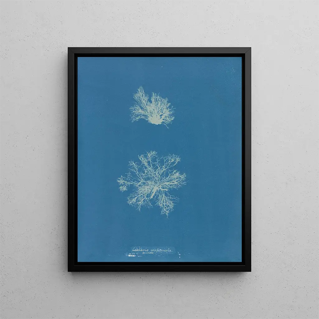 The uniqueness of "Calothrix confervicola" lies in its bold use of the cyanotype technique, a method that allows for creating deep blue impressions. This technique, both rudimentary and sophisticated, gives the artwork a unique atmosphere, where each shade of blue interacts with the texture of the algae. Anna Atkins, as a pioneer of photography, manages to capture not only the physical appearance of her subject but also its essence. The delicate shapes and minute details of this algae are highlighted, creating harmony between the natural subject and the artistic process. This subtle balance between science and aesthetics makes this work a perfect example of botanical art, where each art print becomes a tribute to the beauty of nature.