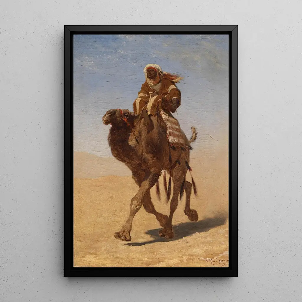 The painting "Cavalier de chameau" by Carl Rudolf Huber depicts a captivating scene where a man, mounted on a camel, crosses a desert landscape. The warm, golden colors evoke the heat of the sun, while delicate shadows add depth to the composition. The artist's technique, blending realism and impressionist touches, creates an atmosphere that is both serene and dynamic. The artwork invites the viewer to escape to distant lands, to feel the warmth of the sand beneath their feet, and to hear the whisper of the wind in the desert.