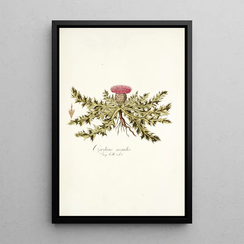 Carduus acaulis : an explosion of spiny colors The art print of Carduus acaulis reveals a fascinating plant world, where vibrant colors and bold shapes intertwine. Shades of violet and bright green are accentuated by the characteristic spines of this plant, creating a striking contrast. The watercolor technique, used by the artist, captures the rough texture of the leaves and the softness of the flowers with great precision. This piece invites visual exploration, where every detail reveals the complexity and beauty of wild flora. Nikolaus Joseph Freiherr von Jacquin : a master of botanical illustration Nikolaus Joseph Freiherr von Jacquin, an emblematic figure of the 18th century, mastered the art and science through his botanical illustrations. Raised in an academic environment, he was influenced by the scientific advances of his time and traveled to study biodiversity. His work on Carduus acaulis demonstrates his commitment to faithfully representing plants while making them accessible to a broader audience. His works are not only illustrations but also testimonies to the richness of nature, contributing to the development of modern botany. A decorative acquisition with multiple assets The art print of Carduus acaulis is a bold decorative choice that will captivate attention in any space. Whether in an office, a living room, or a bedroom, this artwork adds a touch of color and character to your interior. Its printing quality ensures remarkable fidelity to the details of the original piece, offering undeniable aesthetic appeal. By integrating this canvas into your decor, you create a dynamic and inspiring environment, while celebrating the unique beauty of wild flora.