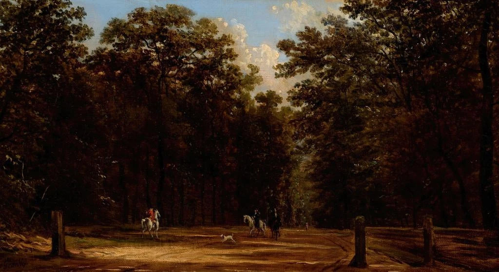 In "Cavaliers in a Park," Victor de Grailly captures a moment of serenity and elegance. The canvas depicts horsemen in the midst of nature, surrounded by lush greenery and majestic trees. The vibrant colors and delicate shades create a lively atmosphere, where light plays with shadows, bringing an almost magical dimension to the scene. The gradient technique and attention to detail in the riders' costumes demonstrate exceptional craftsmanship, inviting the viewer to immerse themselves in this bucolic representation.