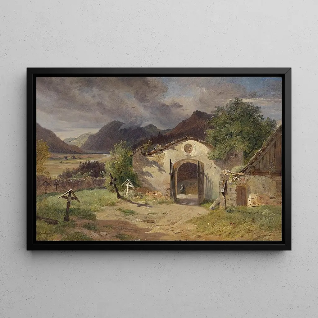 The art print Cemetery in the Salzkammergut by Franz Xaver Reinhold evokes an atmosphere of peace and contemplation. This piece, painted with remarkable delicacy, captures the tranquil beauty of a cemetery surrounded by majestic mountains and lush greenery. The soft colors and shades of gray and green create a melancholic mood, inviting the viewer to reflect on the cycle of life and death. Reinhold's technique, which combines realism and impressionism, gives this canvas an emotional depth that touches the heart.