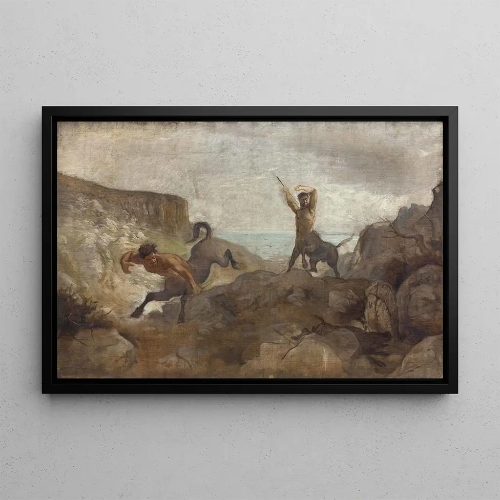 In this captivating artwork, the Boar Hunt Centaur, Ludvig Abelin Schou immerses us in a mythological world where nature and humanity intersect. The dynamic composition of the canvas, with its flowing lines and vibrant colors, evokes a scene of frantic hunting. The earthy tones and flashes of light create an atmosphere that is both wild and majestic, while the centaur, an iconic figure of Greek mythology, embodies raw strength and harmony with nature. Schou's technique, blending realism and romanticism, brings this scene to life, inviting the viewer to feel the intensity of the action.