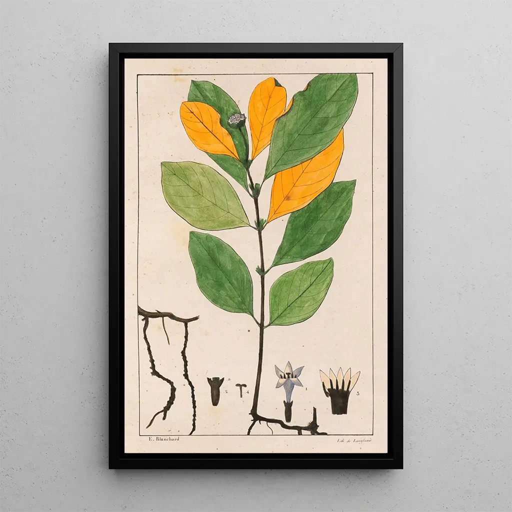 Cepaelis Ipecacuanha : a fascinating botanical exploration The art print of Cepaelis Ipecacuanha immerses us in a universe where nature reveals itself with delicacy. The shades of green, yellow, and brown blend harmoniously, creating an atmosphere that is both soothing and intriguing. The watercolor technique, used by Auguste de Saint-Hilaire, captures the lightness of the leaves and the texture of the stems. Every detail is carefully rendered, inviting the viewer to a attentive contemplation of this medicinal plant. This painting, a true ode to biodiversity, reminds us of the importance of nature in our daily lives. Auguste de Saint-Hilaire : a pioneer of botanical illustration Auguste de Saint-Hilaire, 19th-century botanist and illustrator, dedicated his life to the study of plants, especially in South America. Influenced by the scientific discoveries of his time, he managed to combine scientific rigor with artistic sensitivity. His works, such as this reproduction of Cepaelis Ipecacuanha, testify to his commitment to documenting tropical flora. Saint-Hilaire played a key role in disseminating botanical knowledge, and his illustrations have become references for researchers and art enthusiasts. His legacy endures, reminding us of the importance of nature in art and science. A decorative acquisition with multiple assets The art print of Cepaelis Ipecacuanha is a decorative piece that will enhance your interior, whether in a living room, office, or bedroom. Its print quality guarantees fidelity to the original details, allowing full appreciation of the beauty of this botanical artwork. The aesthetic appeal of this canvas lies in its harmony of colors and its realistic representation, bringing a touch of nature to your decor. By choosing this reproduction, you opt for a piece that combines culture, science, and art, while enriching your living space with a note of serenity.