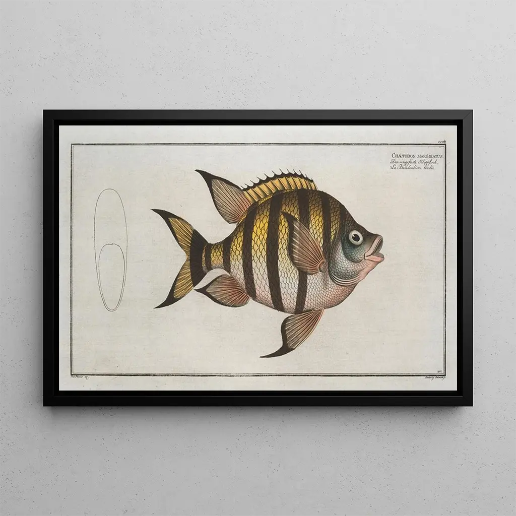 Chaetodon marginatus : an ode to marine biodiversity The art print "Chaetodon marginatus" by Marcus Elieser Bloch depicts a vibrant butterfly fish, illustrating the richness of marine life. The bright hues of yellow, black, and blue combine to create a captivating tableau, where every detail is carefully rendered. Bloch's technique, blending scientific precision with artistic sensitivity, captures the elegance of this aquatic animal. This artwork invites you to explore the depths of the oceans, celebrating the beauty and diversity of marine species. Marcus Elieser Bloch : pioneer of artistic ichthyology Marcus Elieser Bloch, a naturalist and artist of the 18th century, is renowned for his contributions to ichthyology, the study of fish. His work "Ichthyology" is a milestone in the scientific representation of aquatic species. Bloch traveled across Europe and beyond, drawing inspiration from the marine fauna he encountered. His approach combines scientific rigor with aesthetics, making him a pioneer in naturalist art. His illustrations, such as that of the "Chaetodon marginatus," continue to influence artists and scientists today. A decorative art print with multiple virtues The art print of the "Chaetodon marginatus" is a perfect decorative choice for lovers of the sea and nature. Whether in an office, a game room, or an aquarium, this art print will bring a lively and colorful touch to your space. The quality of the reproduction ensures remarkable fidelity to the details of the original work, while offering an attractive aesthetic. By integrating this art print into your decor, you create an inspiring environment that celebrates the beauty of the marine world.