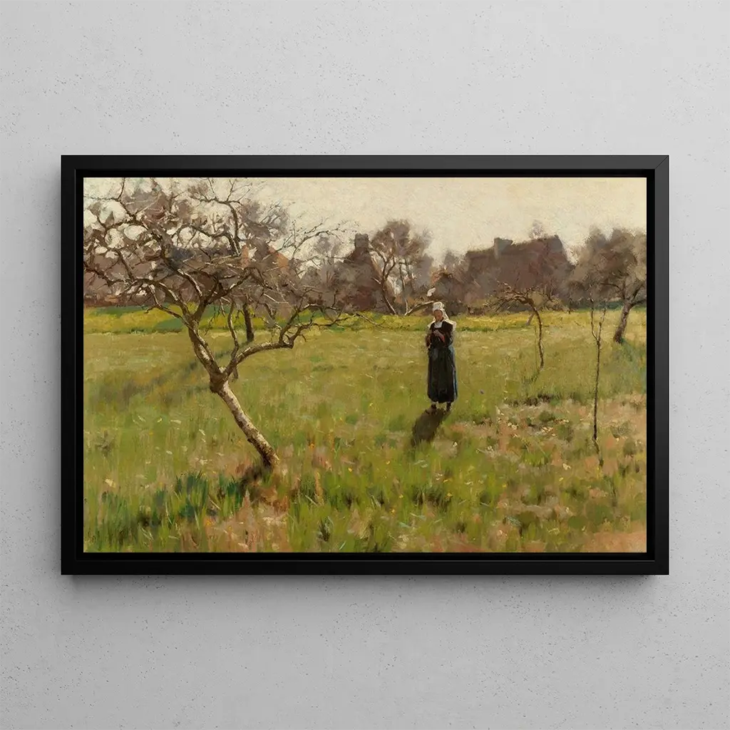 The art print of Champ de Bretagne with figure, created by Arthur Wesley Dow, evokes the wild and peaceful beauty of Breton landscapes. This canvas stands out with its vibrant color palette, where greens and yellows blend to depict lush vegetation. The presence of a human figure, harmoniously integrated into the landscape, adds a narrative dimension to the work. Dow, with his Impressionist technique, manages to capture the light and atmosphere of Brittany, offering an invitation to daydream and escape into this preserved nature.