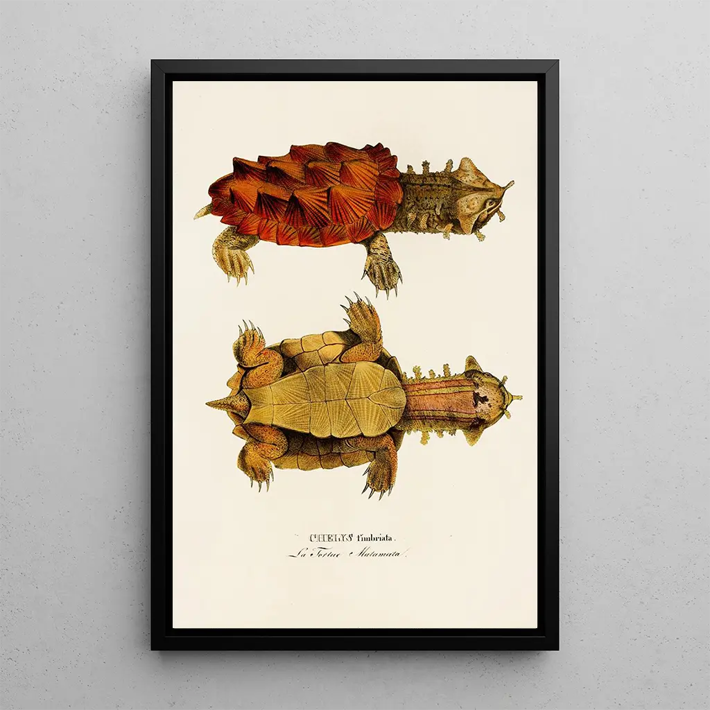 Chelys Fimbriata : an ode to reptilian beauty The art print of Chelys Fimbriata, a work by Johann Baptist von Spix, immerses us in a fascinating universe where the delicacy of forms and the richness of colors intertwine. This painting, depicting a freshwater turtle, stands out with its vibrant hues and meticulous details. The watercolor technique, masterfully employed, gives the piece a mood that is both peaceful and lively. The shades of green and blue evoke aquatic environments, while the light plays on the animal's shell, revealing shimmering reflections. This art print invites attentive contemplation, revealing the hidden beauty of nature. Johann Baptist von Spix : a pioneer of natural history Johann Baptist von Spix, a 19th-century naturalist and explorer, left his mark on his era through his contributions to zoology and anthropology. Born in 1781 in Germany, he undertook a journey to South America that allowed him to discover and document numerous species, including Chelys Fimbriata. His work was influenced by the ideas of scientific romanticism, seeking to combine meticulous observation with aesthetics. von Spix's illustrations, often created with remarkable precision, testify to his commitment to science and art. His legacy endures through his works, which continue to inspire nature enthusiasts. A decorative acquisition with multiple assets The art print of Chelys Fimbriata makes an ideal decorative piece for various living spaces, whether a living room, office, or bedroom. Its print quality and fidelity to the original work make it an attractive choice for art and nature lovers. By incorporating this art print into your decor, you bring a touch of elegance and serenity to your interior. The refined details and soothing colors of this canvas will captivate your guests and create a warm atmosphere. Choosing this art print means adding a piece of art that tells a story and celebrates the beauty of the animal world.