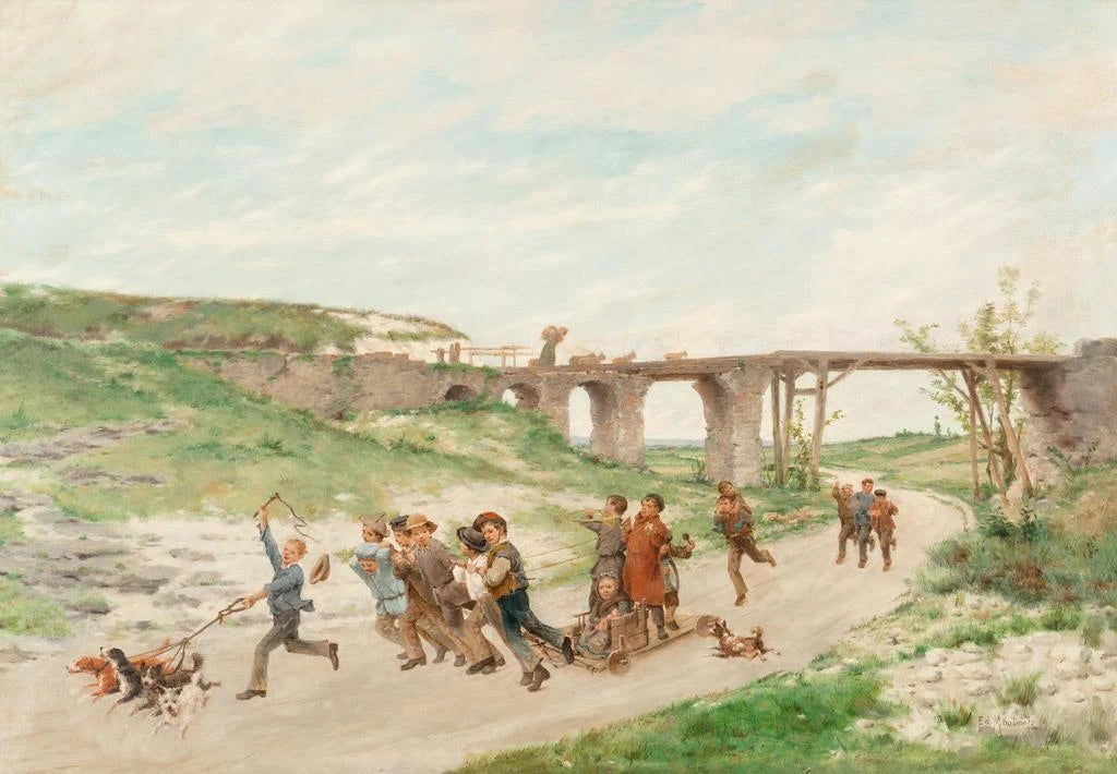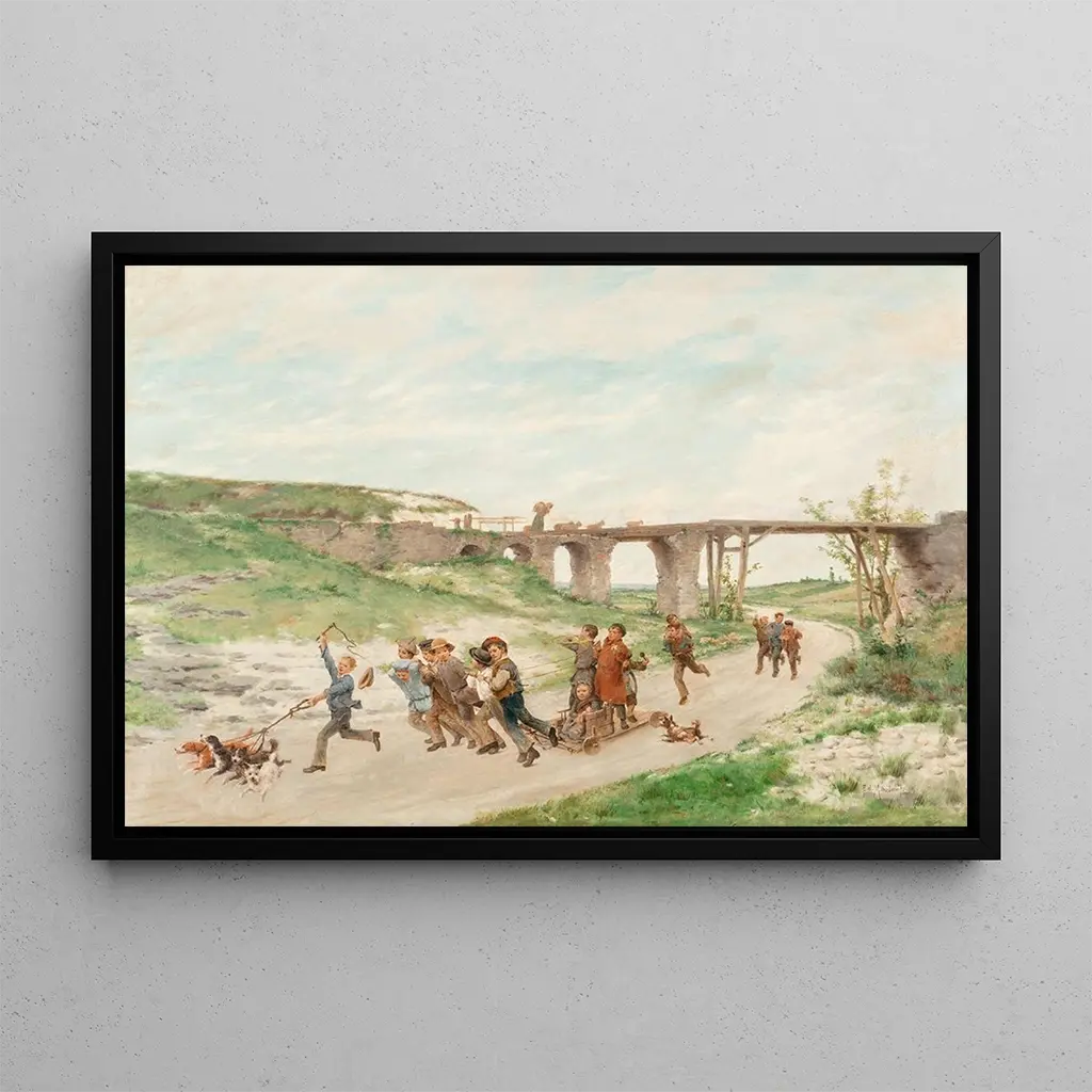 "Children Playing" by Antoine Édouard Joseph Moulinet captures a moment of pure happiness, where children are having fun in a bucolic setting. The bright colors and cheerful expressions of the young protagonists convey an atmosphere of happiness and carefree innocence. Moulinet's technique, characterized by fluid brushstrokes and a keen attention to detail, creates a lively and dynamic scene. This art print evokes not only childhood innocence but also the beauty of simple moments in life, inviting the viewer to reminisce about their own childhood memories.