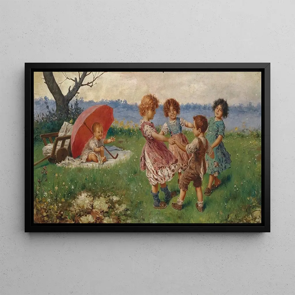 In the art print Children Playing by Federico Oliva, the vibrancy of the colors and the lightness of the strokes capture the very essence of childhood. The children, immersed in their games, seem to flourish in a universe where innocence reigns supreme. The artist's technique, combining softness and precision, creates a warm and welcoming atmosphere. The shades of blue and green evoke nature, while the bursts of light illuminate the joyful faces of the young protagonists. This artwork invites contemplation and nostalgia, recalling the simple and precious moments of youth.