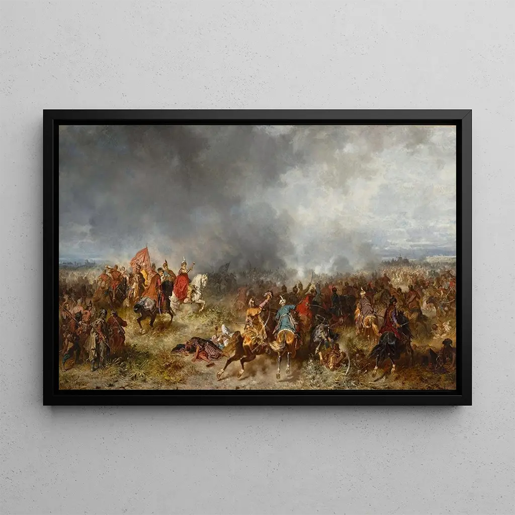 Chodkiewicz at Chocim: a historical drama on canvas "Chodkiewicz at Chocim" is a striking art print that captures a pivotal moment in Polish military history. In this dynamic scene, artist Józef Brandt depicts the Polish hero, Prince Stefan Chodkiewicz, in action, surrounded by his troops. The vivid colors and meticulous details of the armor and horses add dramatic intensity to the composition. Brandt's technique, which skillfully blends realism and romanticism, allows viewers to feel the tension and heroism of this historic moment, transporting them to the heart of the battle. Józef Brandt: the artist of battles and traditions Józef Brandt, a 19th-century Polish painter, is renowned for his representations of military and historical scenes. Influenced by the Romantic movement, he captured the spirit of his era through works that celebrate heroism and Polish culture. Brandt traveled across Europe, drawing inspiration from great masters while developing his own style. His works, often imbued with patriotism, played a crucial role in preserving Polish cultural heritage, making him an emblematic figure of historical art. A decorative acquisition with multiple virtues The art print of the painting "Chodkiewicz at Chocim" makes a remarkable addition to your interior decor. Whether in an office, living room, or study, this canvas will bring a touch of history and grandeur to your space. Its reproduction quality ensures fidelity to the details and colors of the original work, creating an inspiring and dynamic atmosphere. By choosing this art print, you invite not only a piece of history into your home but also a source of conversation and admiration for your guests.