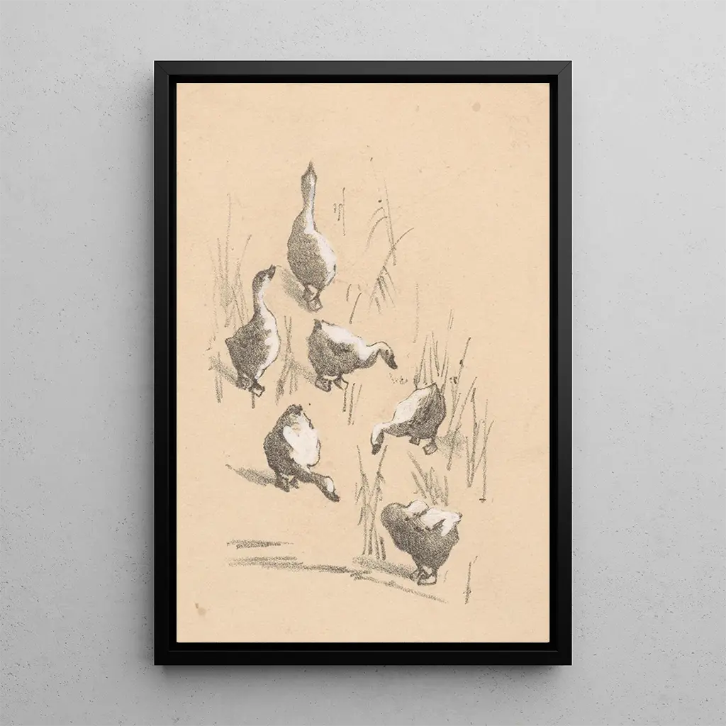 Greeting card with six geese: a tribute to nature in motion The art print of the greeting card with six geese by Theo van Hoytema captures the very essence of wildlife. The geese, depicted in an aerial dance, seem to float gracefully against a background of soft, pastel hues. The artist's technique, blending watercolor and drawing, creates a light and poetic atmosphere, inviting the viewer to escape into a natural world. The meticulous details of the feathers and reflections in the water add a lively dimension to this piece, making each glance a new discovery. Theo van Hoytema: a master of naturalist illustration Theo van Hoytema, a Dutch artist active at the end of the 19th and beginning of the 20th century, is renowned for his delicate illustrations and representations of fauna. Influenced by the Art Nouveau movement, he skillfully combined aesthetic appeal with scientific precision in his works. His work, often focused on nature, reflects a deep admiration for the animal and plant worlds. Van Hoytema also collaborated with various magazines and publications, which contributed to his fame and impact on illustration of his era. His artistic legacy continues to inspire nature lovers and art enthusiasts. A decorative acquisition with multiple assets The art print of the greeting card with six geese is an ideal decorative choice to bring a touch of serenity to your interior. Whether in a living room, office, or bedroom, this piece harmoniously fits into various decorating styles. Its print quality and fidelity to the original colors ensure lasting aesthetic appeal. By choosing this canvas, you opt for a piece that evokes the beauty of nature while adding an artistic note to your living space.