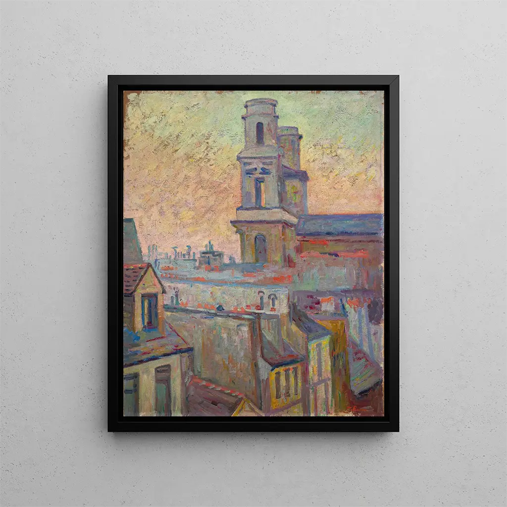 Guillaumin, an iconic figure of the Impressionist movement, stands out for his bold approach to color and light. In this piece, he deploys a rich palette, where shades of blue, yellow, and pink intertwine to evoke the brightness of the Parisian sky. His style, both free and structured, allows for a unique interpretation of the church’s architecture, while preserving the majesty of its lines. The way he captures the reflections of light on the stone facades, as well as the shadows cast by the surrounding trees, demonstrates remarkable technical mastery. Every element of the painting seems to vibrate, as if the church itself were animated with a life of its own. The composition, both balanced and dynamic, invites the eye to wander across the artwork, revealing unsuspected details with each viewing.