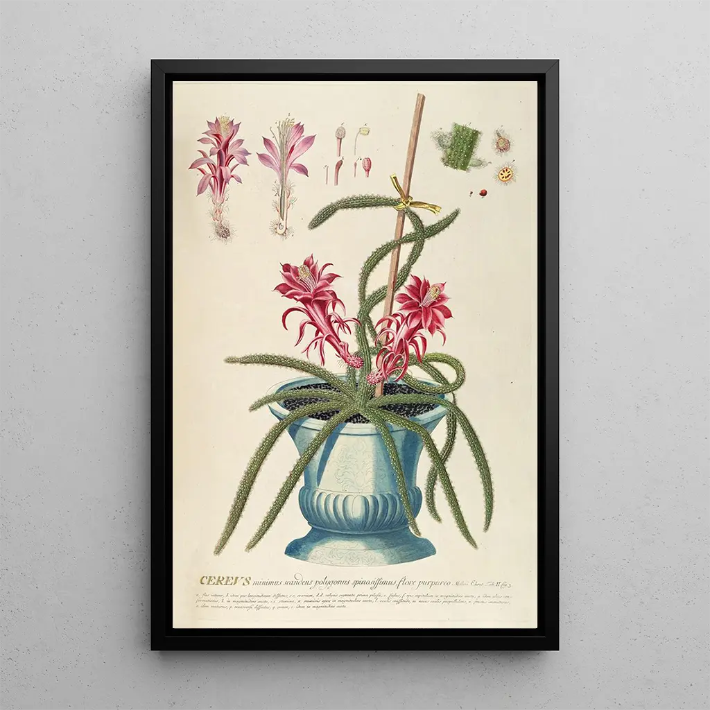 Cierge II, an iconic art print by Georg Dionysius Ehret, evokes a fragile and ephemeral beauty. This art print highlights a floral composition where the waxes intertwine gracefully, creating a subtle play of light. The pastel colors, ranging from bright white to tender green, infuse an atmosphere of serenity and freshness. The gouache technique, used with finesse, allows each detail of the petals and leaves to be rendered in an almost tactile manner. This artwork invites attentive contemplation, revealing the meticulousness and love of detail that characterize Ehret's work.