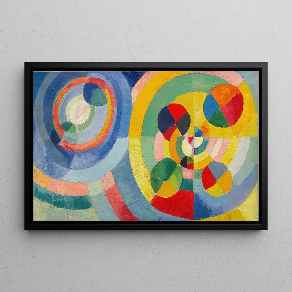 The art print of "Circular Forms" by Robert Delaunay is a true celebration of visual dynamism. The colorful circles intertwine and overlap, creating a sensation of perpetual movement that draws the eye. The bright and bold colors, typical of the Orphic style, evoke a vibrant, almost musical energy. This canvas invites active contemplation, where each glance reveals new nuances and interactions between the shapes. Delaunay succeeds in capturing the very essence of modernity through this work, making each element a symbol of bustling urban life.
