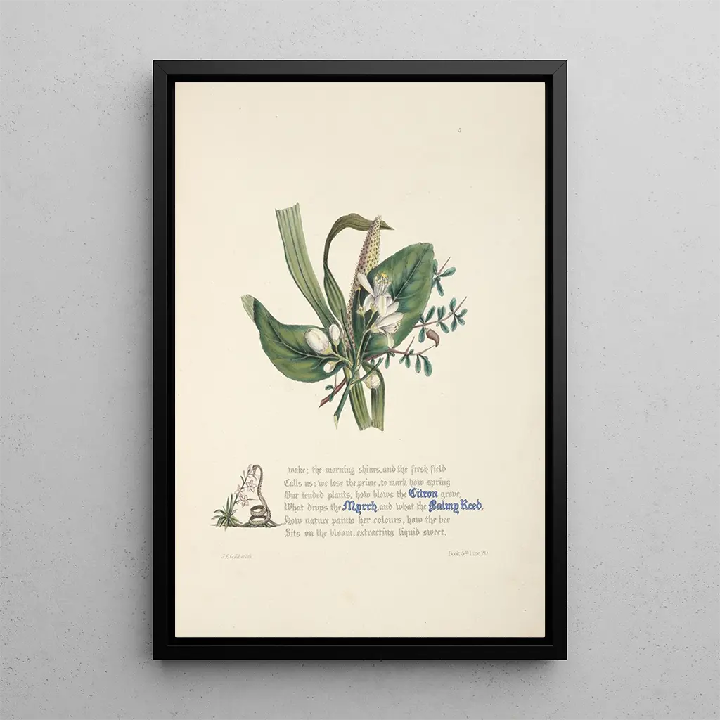 The art print of "Citron myrrh and balsamic reed" transports us into a rich and captivating sensory universe. The golden and green hues blend subtly, evoking the delicate aromas of the depicted plants. Jane Elizabeth Giraud, through her meticulous technique, manages to capture the light playing on the leaves and flowers, creating an almost magical atmosphere. Each element of the composition seems to tell a story, inviting the viewer to immerse themselves in this lush garden. This canvas is an ode to nature, where every detail promises sensory discoveries.