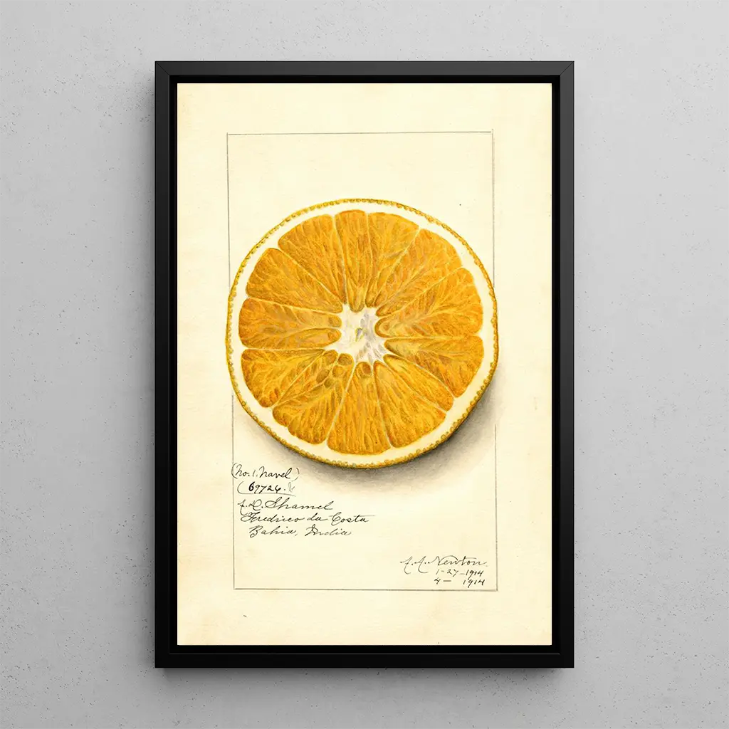 Citrus paradisi Navel : a celebration of vibrant nature In this art print of Citrus paradisi Navel, the artist Amanda Almira Newton immerses us in a lively world of colors and textures. The juicy oranges, beautifully detailed, seem almost tangible, while the green leaves surrounding them add a touch of freshness to the composition. Newton's technique, blending watercolor and oil, creates a luminous and joyful atmosphere, inviting the viewer to appreciate the simple, natural beauty of citrus fruits. Each brushstroke reveals meticulous attention to detail, making this work a true ode to nature. Amanda Almira Newton : a pioneer of botanical realism Amanda Almira Newton, active in the early 20th century, is recognized for her role in the development of American botanical art. Influenced by the artistic movements of her time, she captured the delicacy of plants and fruits with striking realism. Her work stands out for its scientific precision and refined aesthetic, which allowed her to establish a reputation in the artistic community. By exploring the beauty of natural forms, Newton contributed to a better understanding and appreciation of botanical sciences through art, making her an important figure of her era. A decorative acquisition with multiple assets The art print of Citrus paradisi Navel is an ideal choice to enhance your interior, whether in a living room, office, or bedroom. Its vibrant color palette and realistic depiction bring a touch of freshness and vitality to any space. The quality of the print ensures fidelity to the details of the original work, allowing you to enjoy every nuance and texture. By choosing this piece, you opt for a decorative item that not only catches the eye but also evokes a connection with nature, enriching your daily environment.