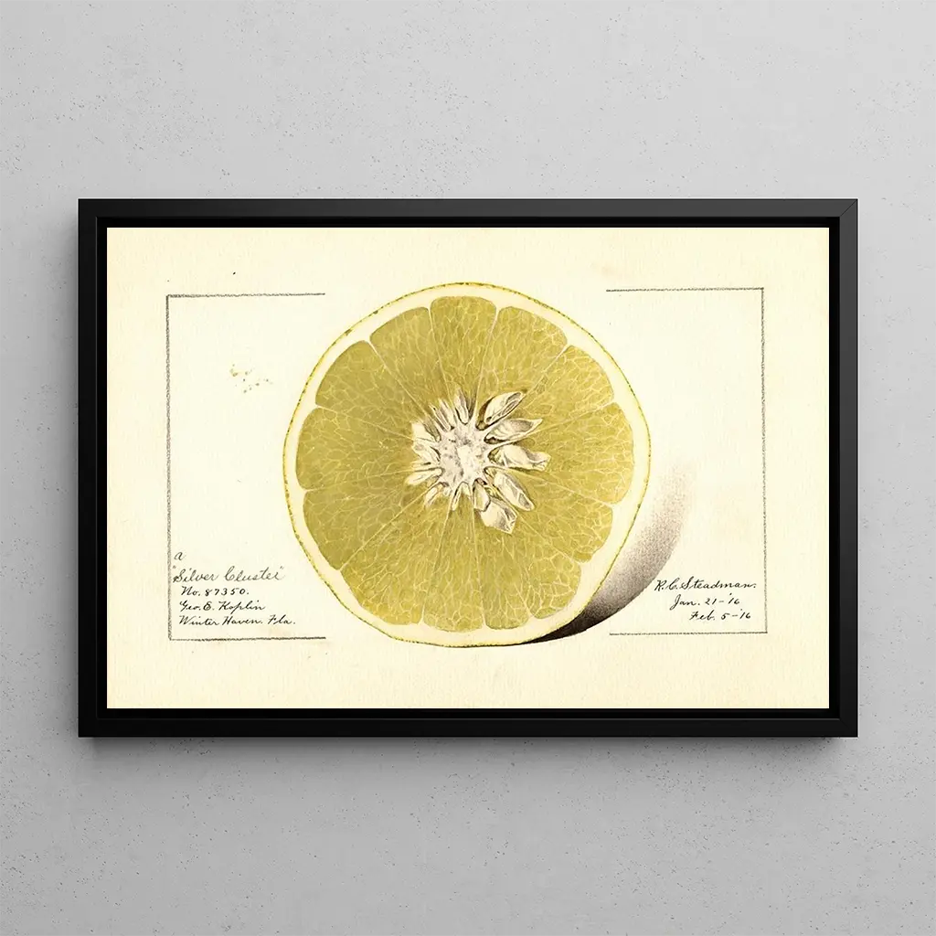 Citrus paradisi Silver Cluster: an explosion of fruity colors The art print of Citrus paradisi Silver Cluster immerses us in a vibrant universe where shades of yellow, green, and white intertwine to create a lively composition. The painting evokes the freshness of citrus fruits, with juicy fruits that seem almost tangible. The artist's technique, blending watercolor and oil, offers a lightness to the work, while natural light accentuates the reflections and shadows. The atmosphere conveyed by this canvas is both joyful and soothing, inviting the viewer to savor the simple beauty of nature. Royal Charles Steadman: a master of botanical realism Royal Charles Steadman, active at the end of the 19th century, is renowned for his works that celebrate the beauty of the natural world. Influenced by the realism movement, he specialized in the precise representation of plants and fruits, capturing their essence with remarkable meticulousness. His works, often inspired by botany, testify to a deep respect for nature and a desire to preserve it through art. Steadman managed to combine aesthetics and science, making his paintings references in the field of floral art. A decorative acquisition with multiple assets The art print of Citrus paradisi Silver Cluster is an ideal choice to enhance your interior, whether in a living room, office, or bedroom. Its luminous palette and refined details bring a touch of freshness and vitality to any space. The quality of the print guarantees fidelity to the original work, allowing you to enjoy its aesthetic appeal daily. By integrating this piece into your decor, you give your environment a note of elegance and nature, while inspiring admiration from your guests.