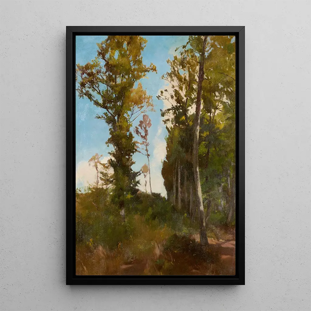La reproduction de "Clairière près de Purkersdorf" nous plonge dans un paysage serein où la lumière filtre à travers les feuillages denses. Les couleurs, allant des verts profonds aux touches dorées du soleil couchant, créent une atmosphère apaisante et contemplative. La technique de Carl Schuch, qui mêle habilement le réalisme à une touche impressionniste, donne vie à chaque élément de la scène. Les détails minutieux des arbres et la douceur de l'herbe invitent le spectateur à s'immerger dans cette clairière, comme s'il pouvait entendre le murmure du vent et le chant des oiseaux.