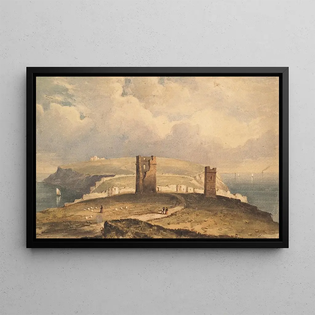 In this art print of "Coastal scene with ruins," William Wyld transports us to a beach where time seems to have stood still. The ruins, remnants of a bygone era, rise majestically against a cloudy sky, while the waves gently lap the shore. The color palette, dominated by shades of blue and gray, evokes an atmosphere that is both serene and nostalgic. Wyld's technique, skillfully blending watercolor and oil, brings this scene to life, creating a play of light that highlights the beauty of the architectural details and the fluidity of the sea.