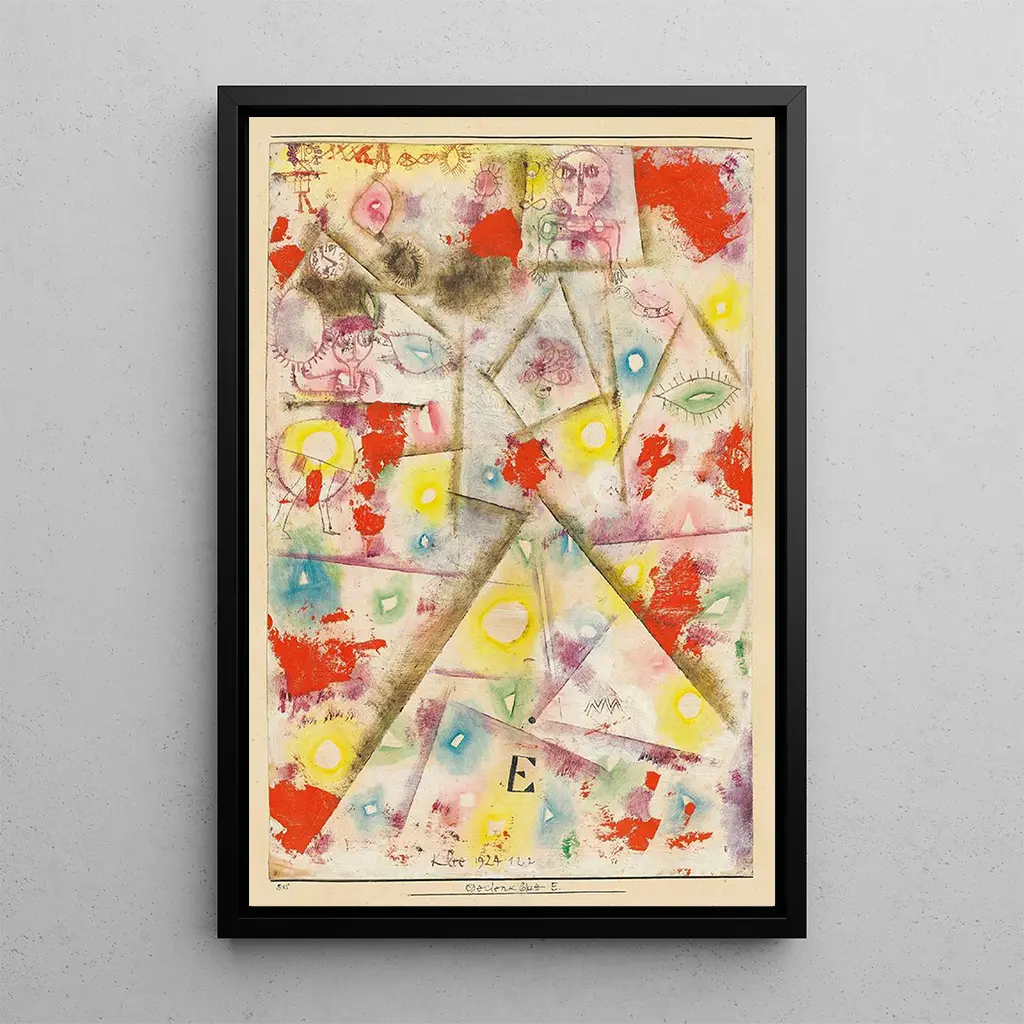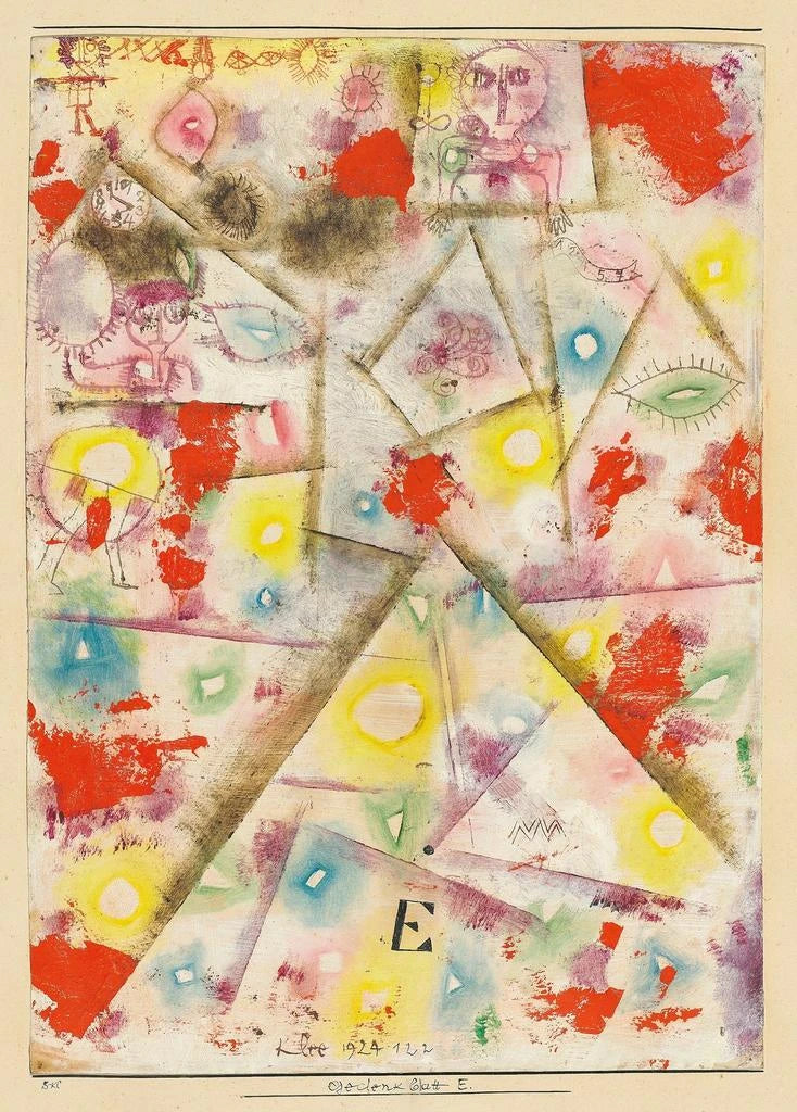 Paul Klee, born in 1879 in Switzerland, is one of the most influential artists of the 20th century. A member of the Bauhaus, he successfully combined art and teaching, influencing many contemporary artists. His unique style, which merges abstraction and figuration, is inspired by his travels, music, and nature. Klee was deeply influenced by surrealism and expressionism, which is reflected in his works, where imagination takes precedence over reality. "Feuille Commémorative E" reflects this quest for innocence and magic, characteristic of his work, while fitting into an era where art sought to break free from conventions.