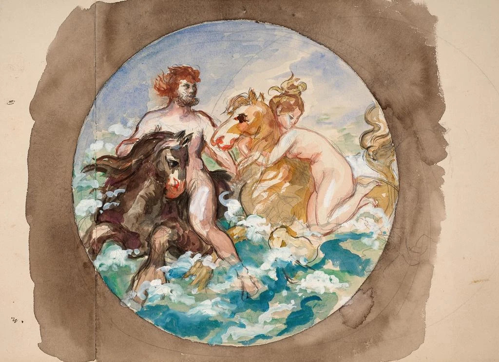 The art print of "Couple on seahorses" immerses us in a fantastical universe where love and the sea meet. This painting, rich in vivid colors and delicate details, evokes a dreamlike scene where the characters seem to float in an aquatic world. The seahorses, symbols of gentleness and protection, add a magical dimension to this work. The etching technique used by Félix Bracquemond gives a unique texture, making each element lively and vibrant, as if it were a dance between waves and hearts.