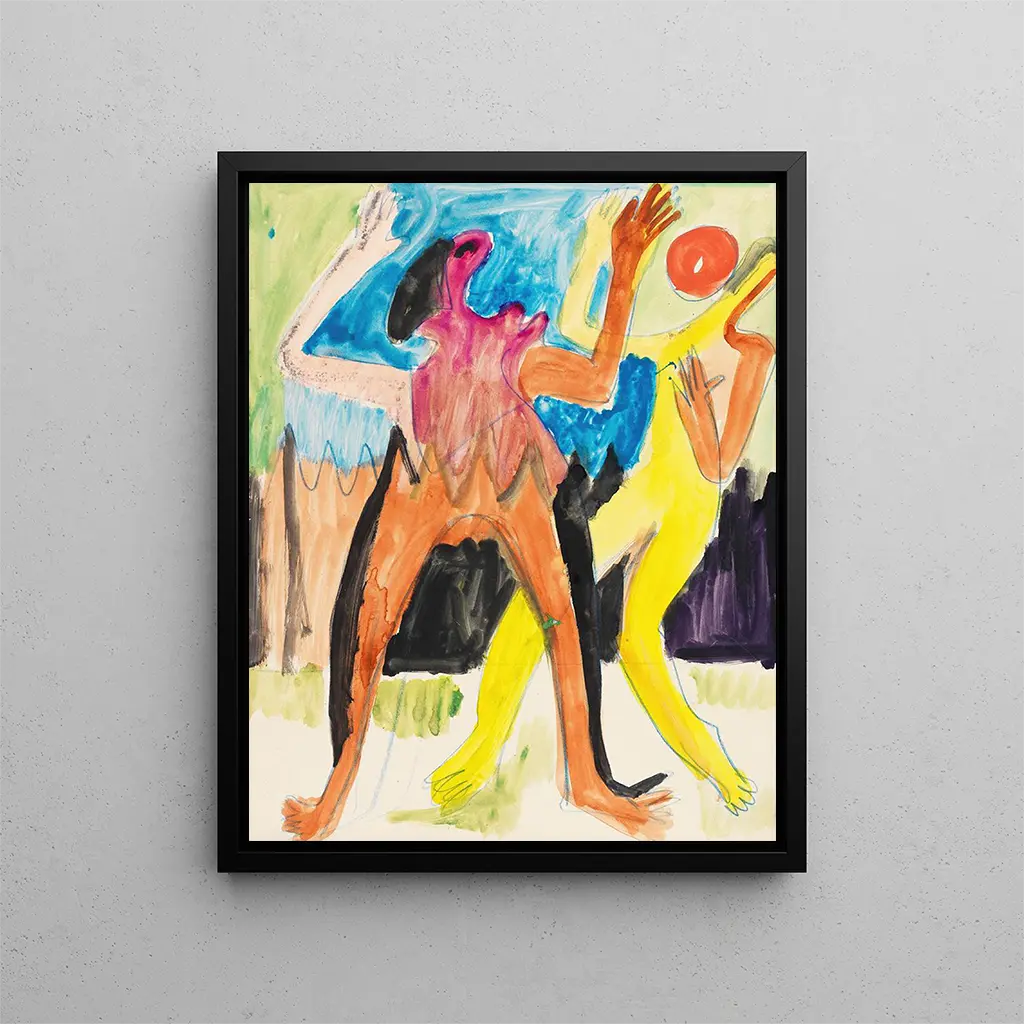 Ernst Ludwig Kirchner's artwork "Couple jouant au ballon" invites viewers to immerse themselves in the vibrant and expressive world of early 20th-century art. Kirchner, a key figure of the expressionist movement, masterfully captures a moment of simple, authentic joy, where two characters engage in childhood play. This scene, both playful and tinged with a certain melancholy, evokes the fleeting pleasures of life while reflecting the tensions of its time. The art print of this piece allows not only for the appreciation of the composition's beauty but also for a deeper understanding of the emotions it conveys. Style and uniqueness of the work Kirchner's style is characterized by vivid colors and stylized forms, typical of expressionism. In "Couple jouant au ballon," the outlines of the characters are accentuated, almost distorted, giving the piece a unique dynamism. The bright hues evoke the light of a sunny day, while the gestures of the protagonists, both graceful and energetic, demonstrate a freedom of expression that transcends the simple framework of play. Every brushstroke seems charged with palpable energy, inviting the viewer to feel the intensity of this shared moment. By playing with contrasts and shapes, Kirchner creates an atmosphere that is both joyful and introspective, where happiness blends with a touch of nostalgia. The artist and his influence Ernst Ludwig Kirchner, born in 1880, was one of the founders of the group Die Brücke, which played a crucial role in the development of modern art. His work is deeply influenced by his engagement with urban life and the social tensions of his era. Kirchner translated the upheavals of early 20th-century German society onto his canvases, oscillating between enthusiasm for new freedoms and anxiety about modernity. His bold style and ability to express complex emotions have inspired many subsequent artists, making him an essential figure in art history.